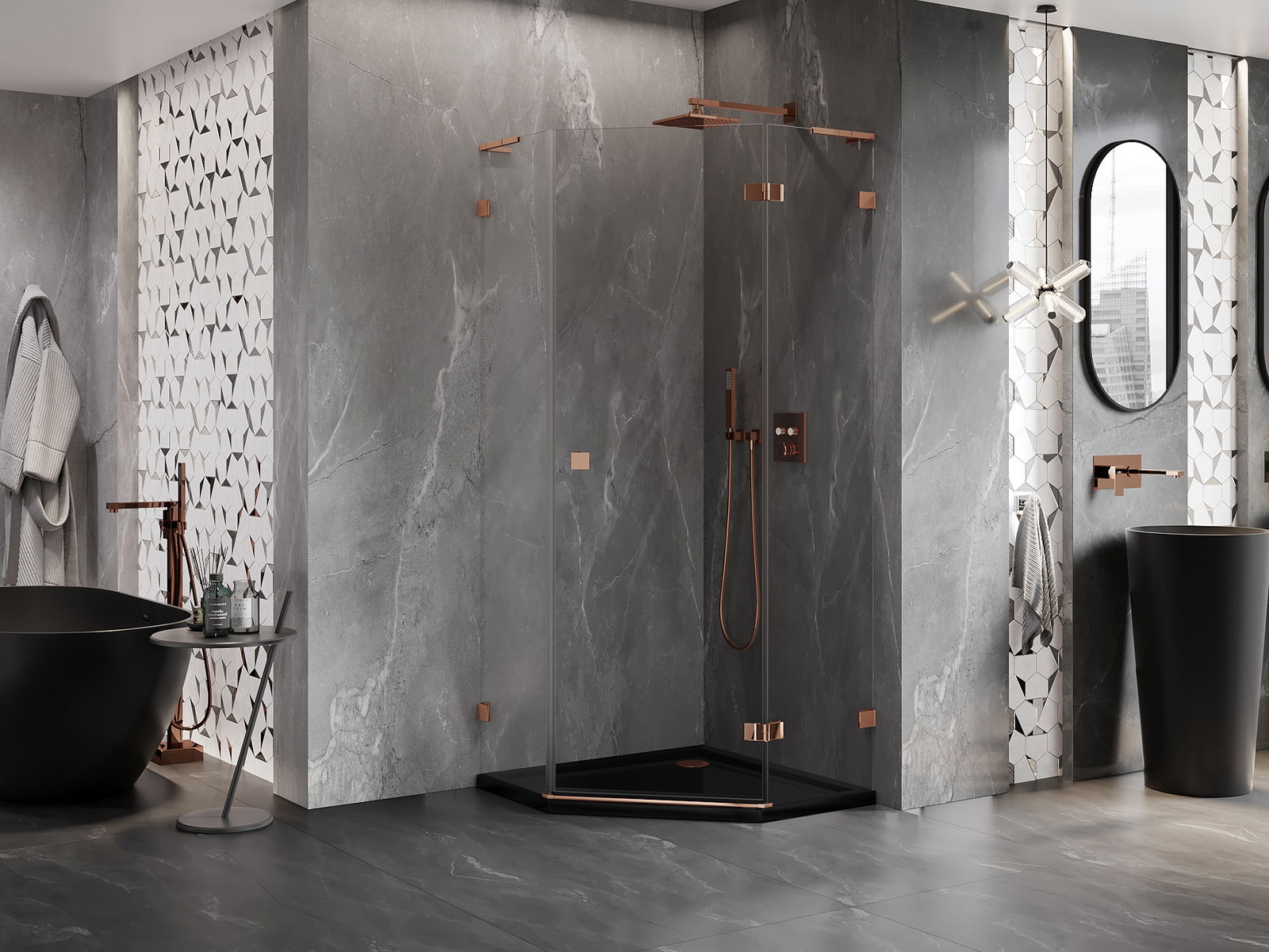 Mexen Lunar L päťuholníková sprchová kabína na pravú stranu 90 x 90 cm, transparentná, ružové zlato - 831L-090P-090L-60-00-P