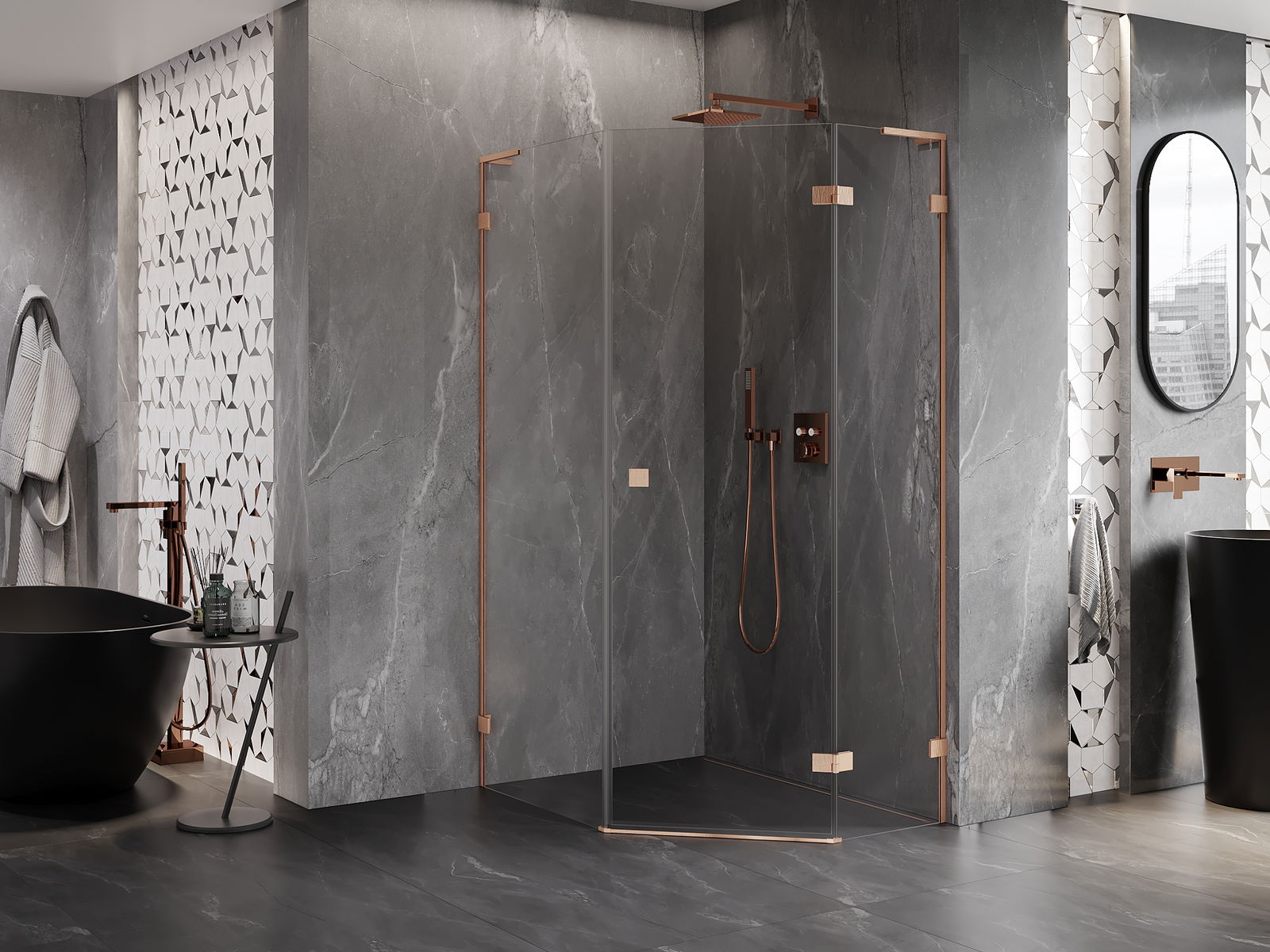 Mexen Lunar L päťuholníková sprchová kabína sklápacia pravá 80 x 100 cm, transparentná, brúsená meď - 831L-080P-100L-65-00-P