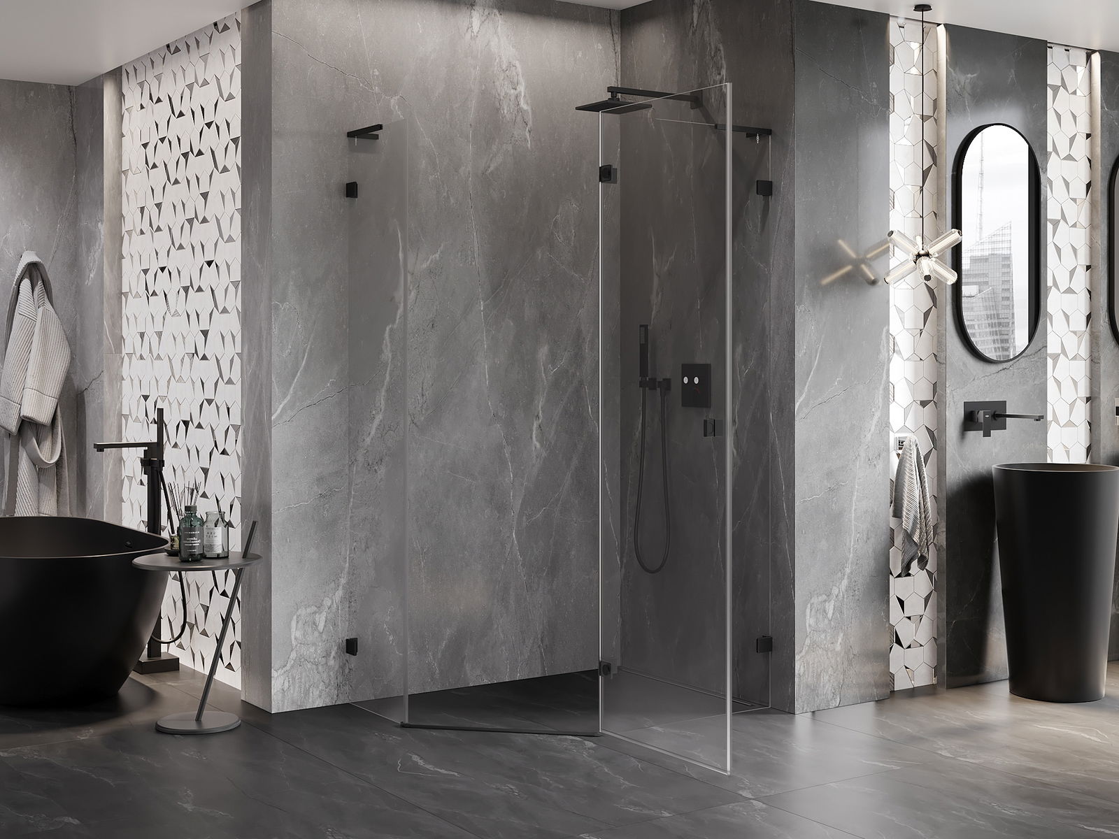 Praktická a pohodlná rukoväť je vyrobená z odolného a pevného kovu. Moderný tvar v kombinácii s povrchovou úpravou prispôsobenou farbe profilov dodáva celku moderný a štýlový vzhľad, zdôrazňujúc estetiku každej kúpeľne.