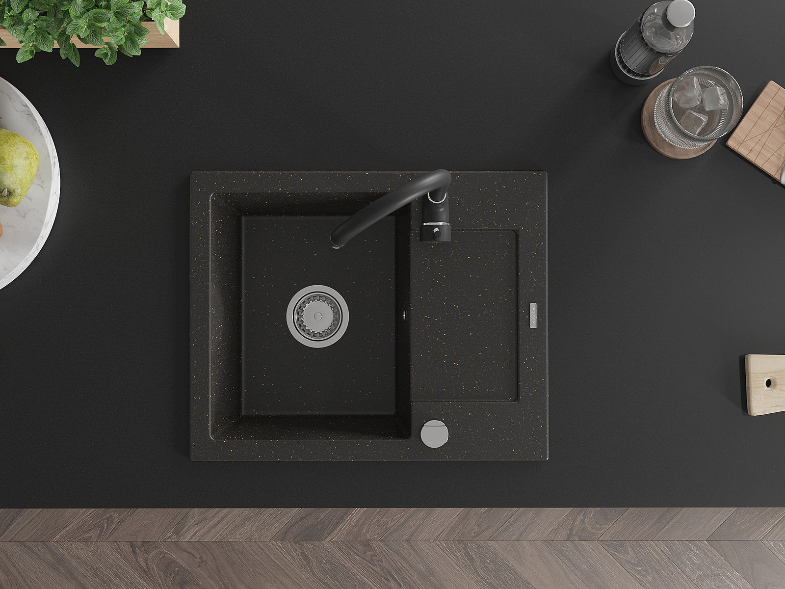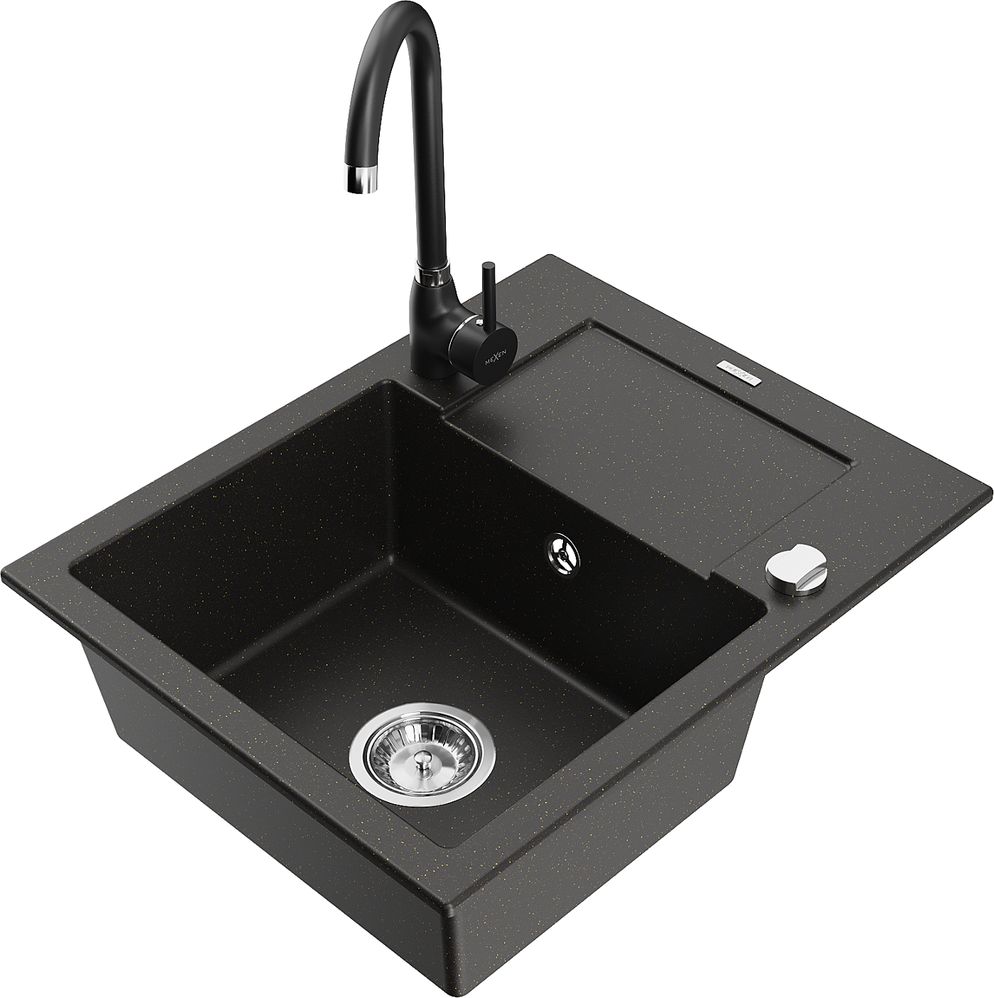 Mexen Enzo granitový drez s 1 komorou a odkvapkávačom a kuchynskou batériou Telma, čierny/zlatý - 6506-75-670200-70