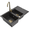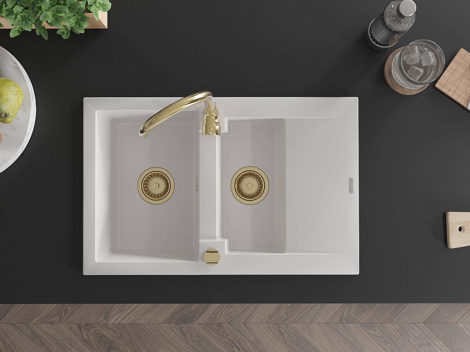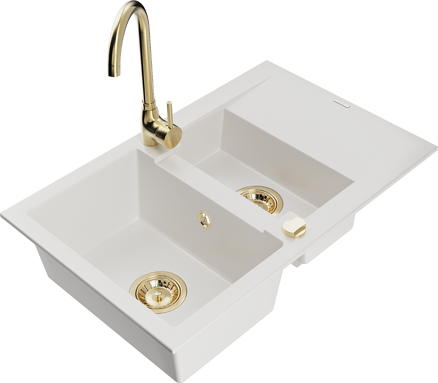 Mexen Gaspar žulový kuchynský drez 1,5-komorový s odkvapkávačom a kuchynskou batériou Telma, biely - 6507-20-670200-50