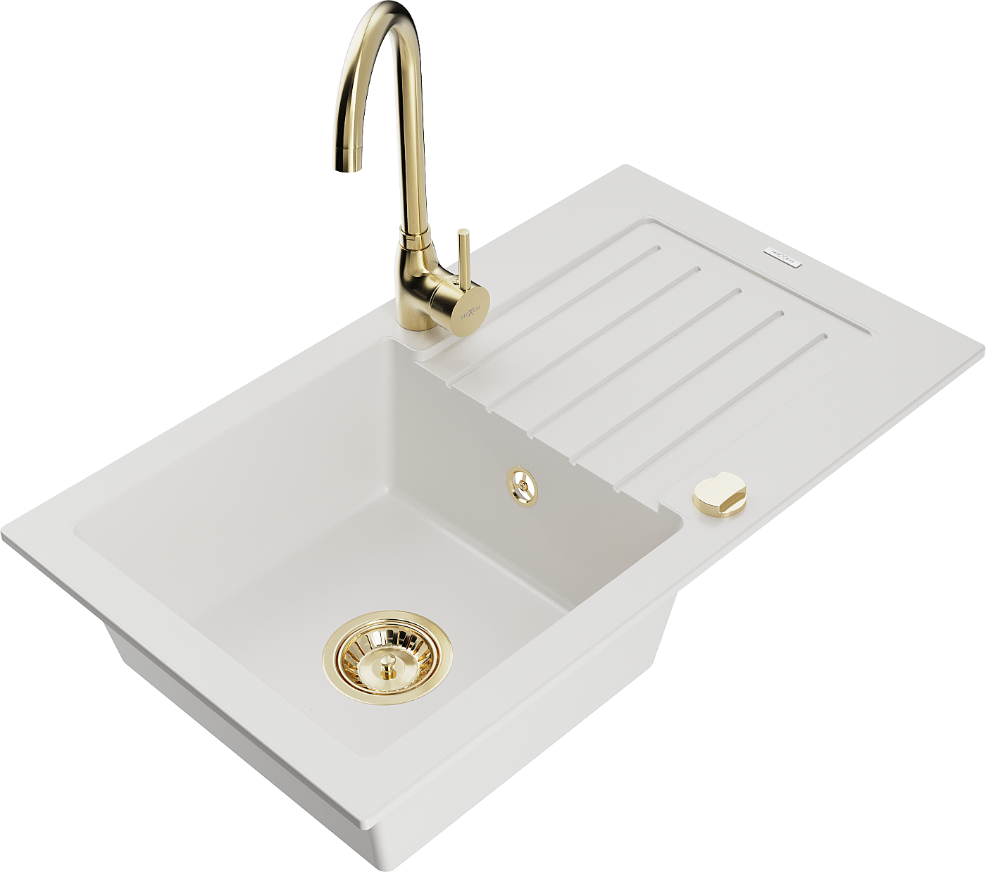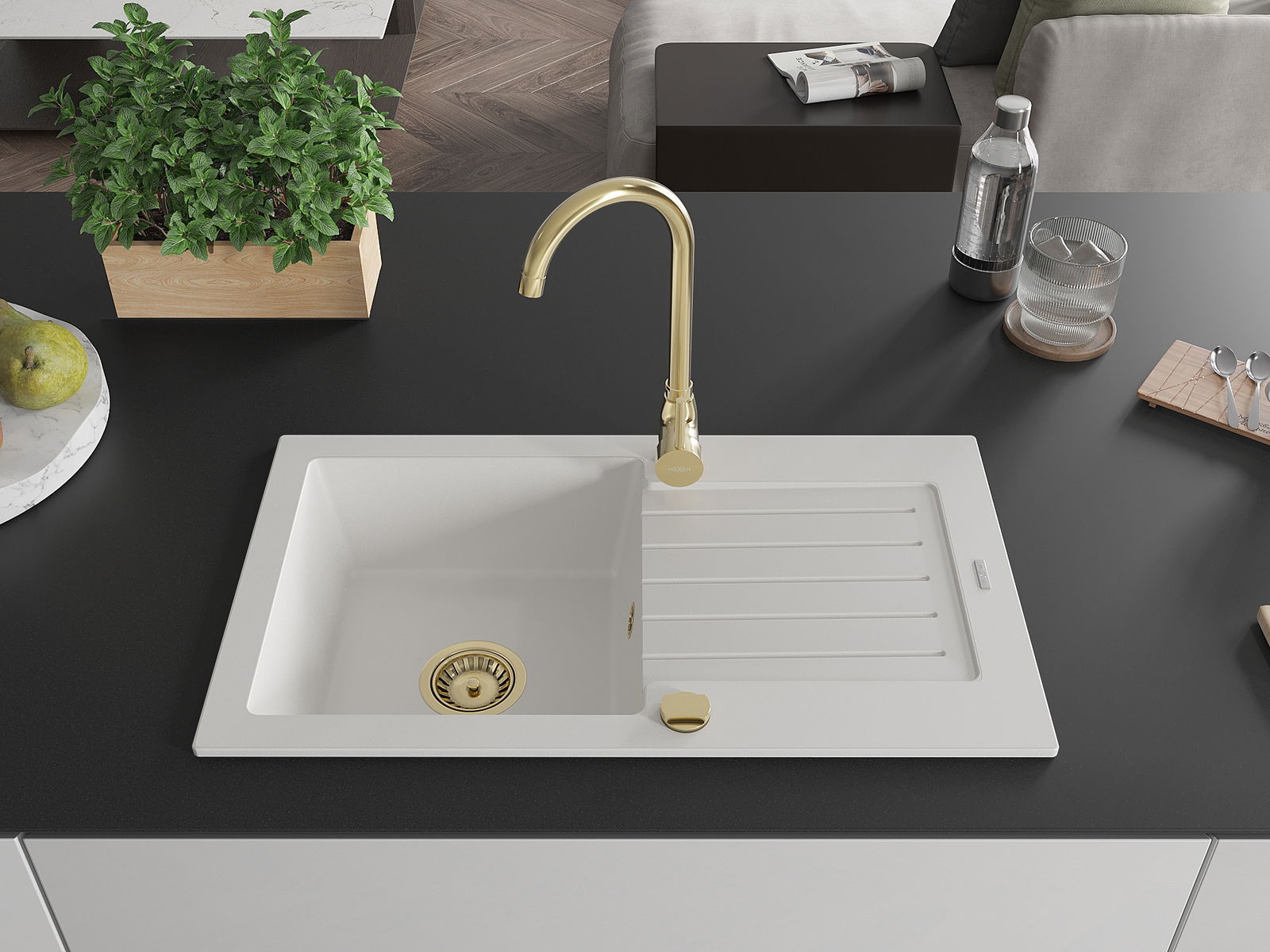 Mexen Pablo granitový kuchynský drez 1-komorový s odkvapkávačom a kuchynskou batériou Telma, biely - 6510-20-670200-50