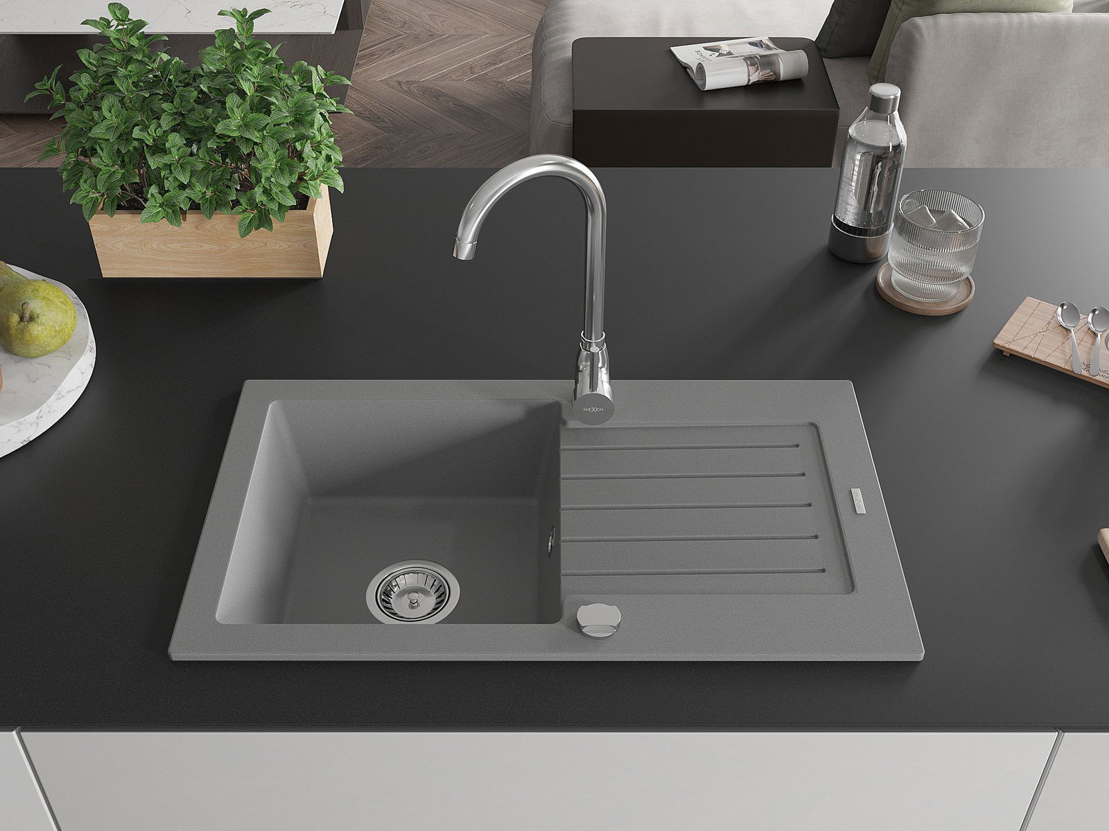 Mexen Pablo žulový kuchynský drez s 1 miskou a odkvapkávačom a kuchynskou batériou Telma, sivý - 6510-71-670200-00