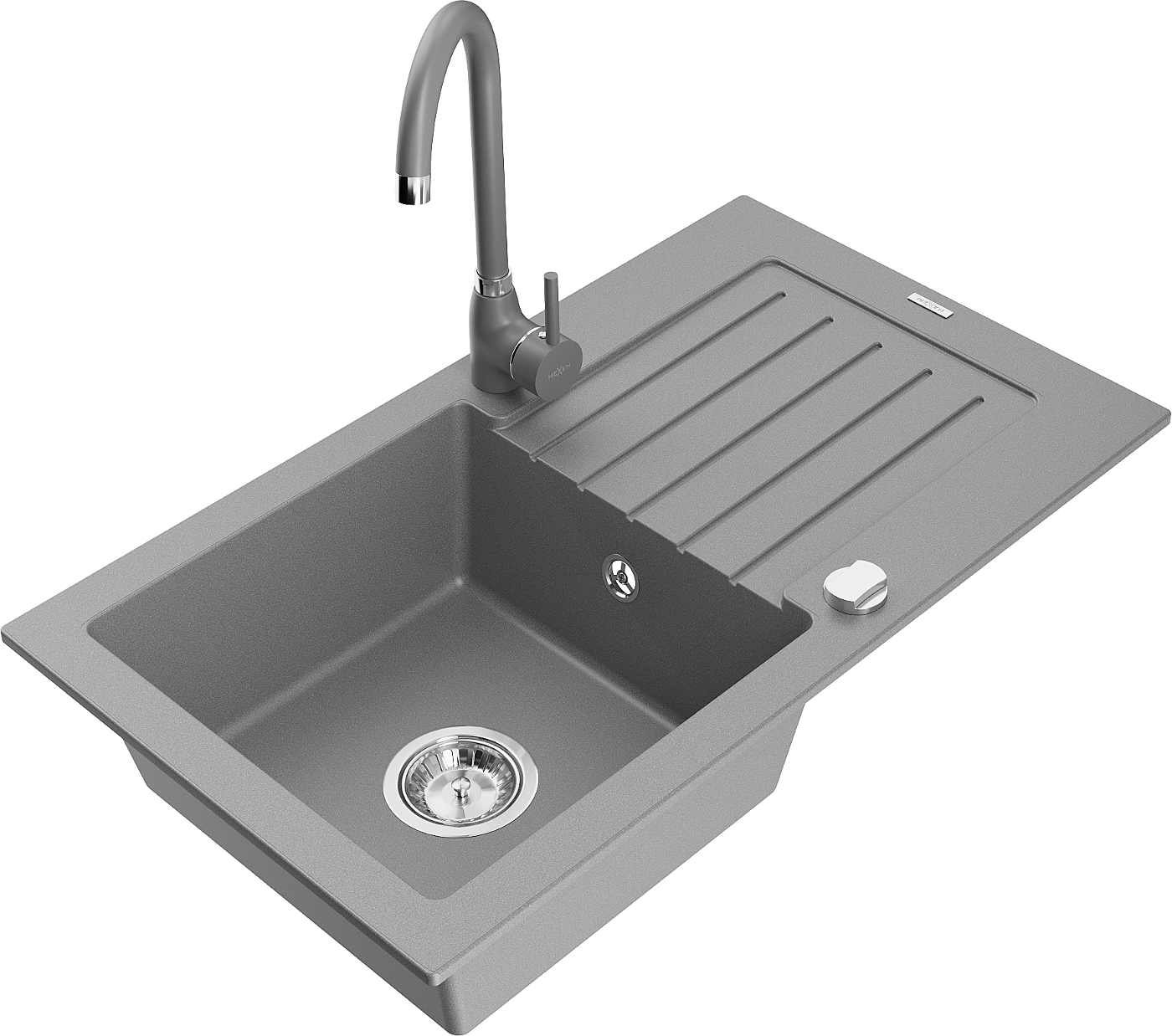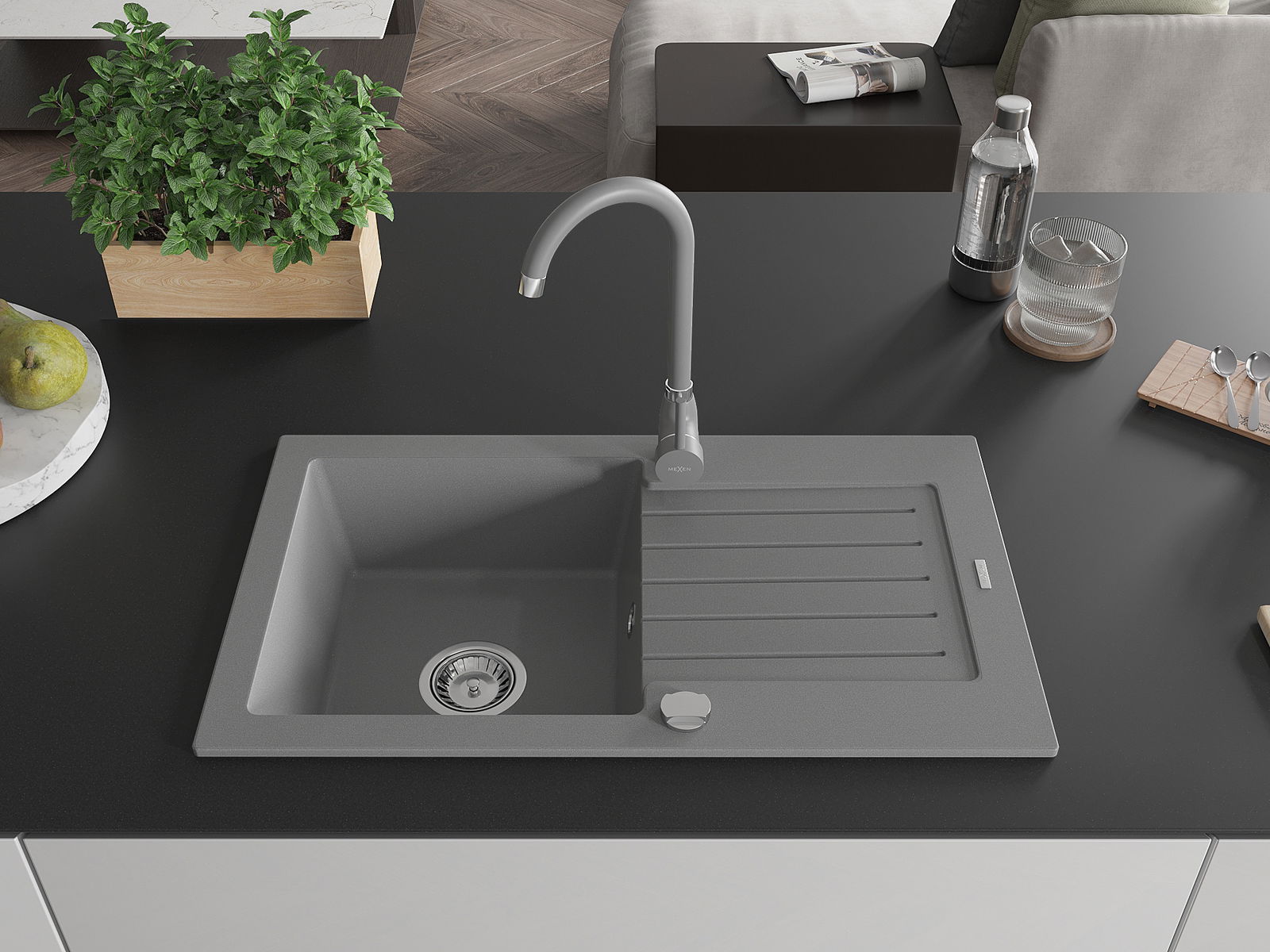 Mexen Pablo granitový drez 1-komorový s odkvapkávačom a kuchynskou batériou Telma, šedá - 6510-71-670200-71
