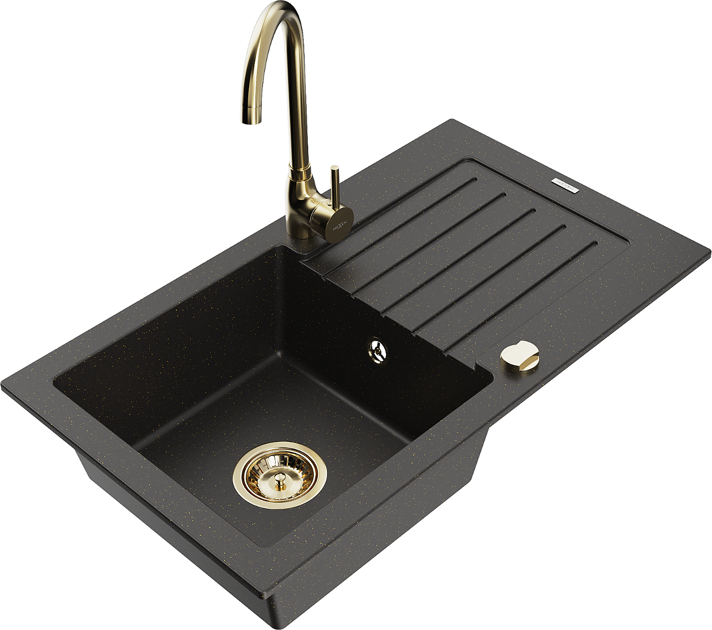 Mexen Pablo žulový drez 1-komorový s odkvapkávačom a kuchynskou batériou Telma, čierny/zlatý - 6510-75-670200-50