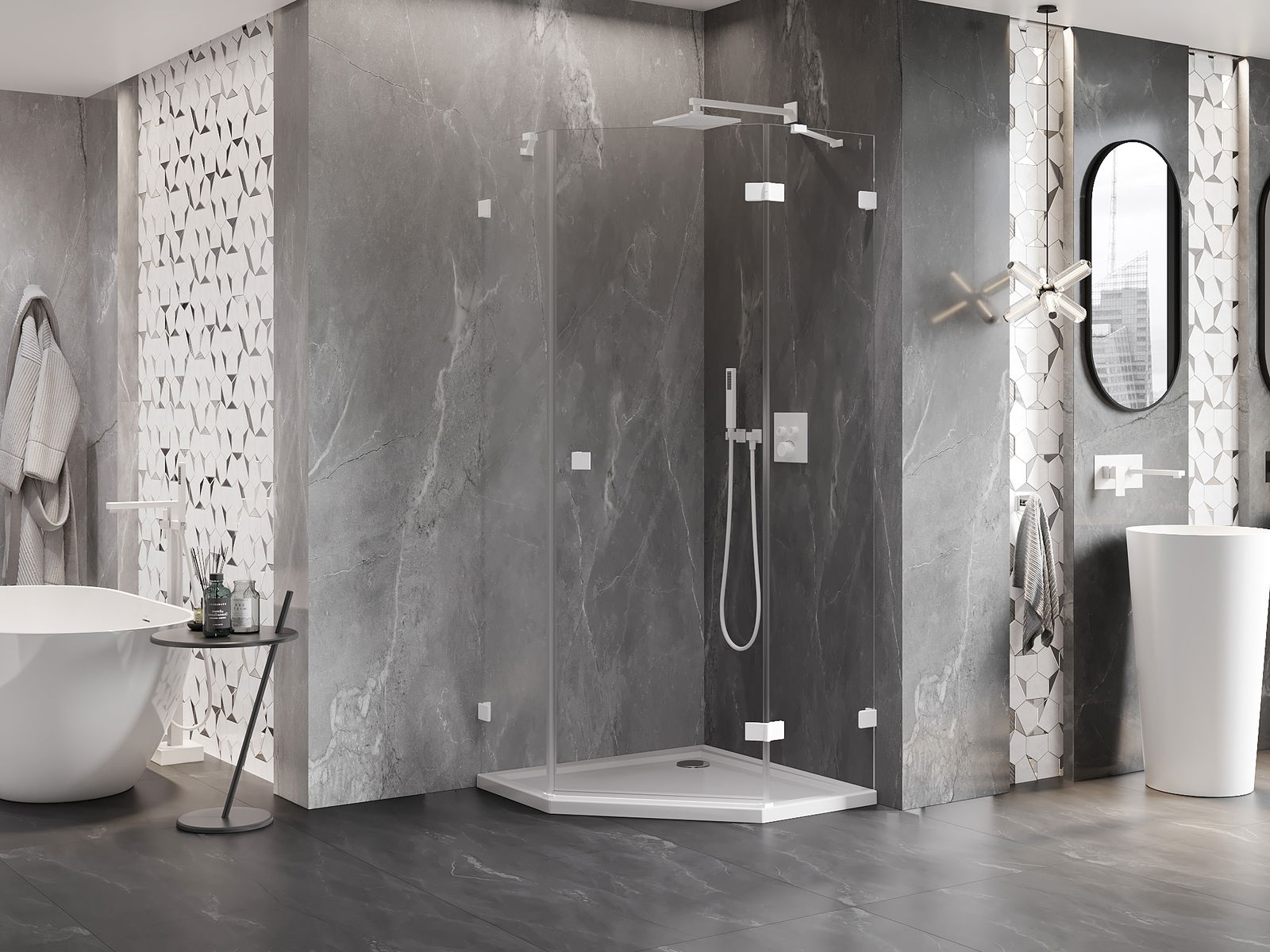 Mexen Lunar päťuholníková sprchová kabína výklopná pravá 90 x 90 cm, transparentná, biela - 831-090P-090L-20-00-P