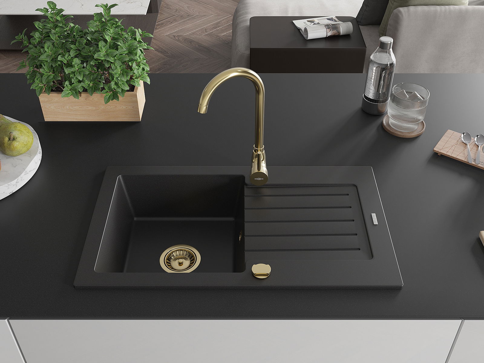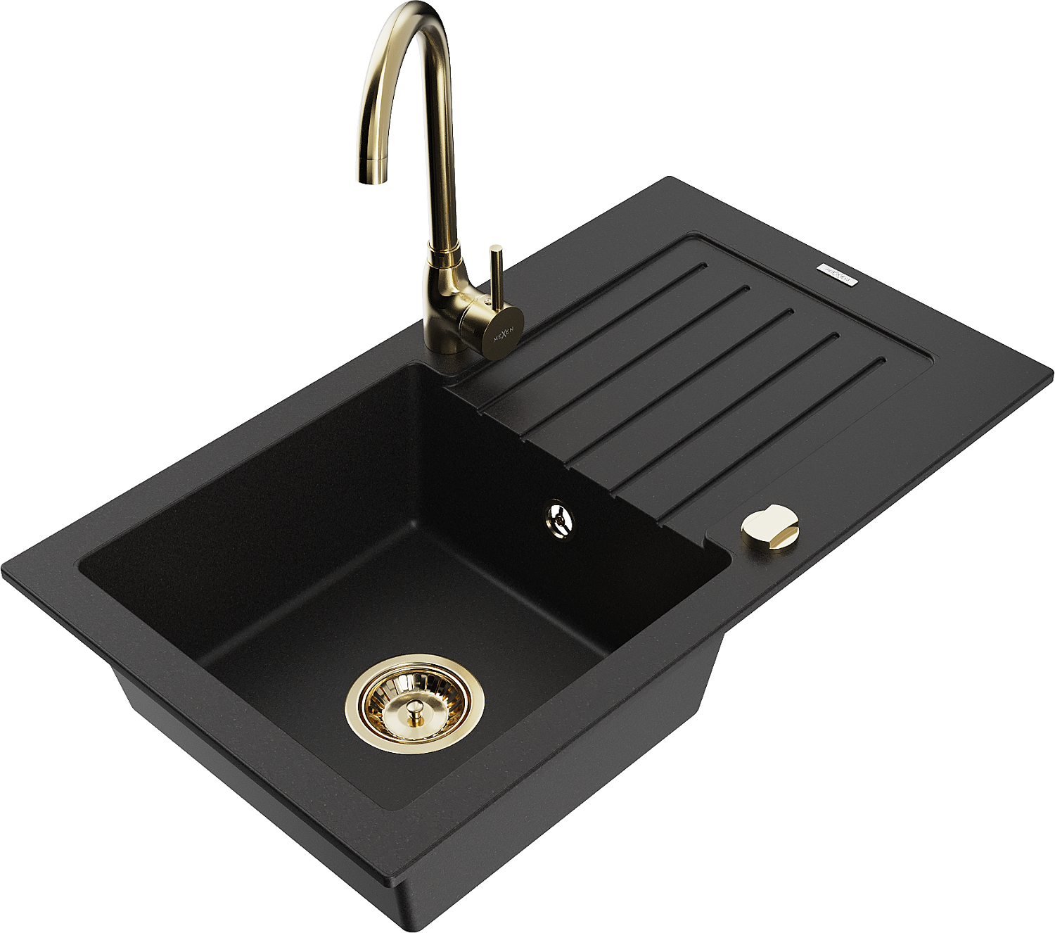 Mexen Pablo žulový kuchynský drez 1-komorový s odkvapkávačom a kuchynskou batériou Telma, čierny - 6510-77-670200-50