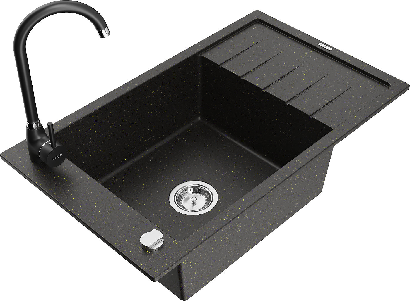 Mexen Elias kuchynský drez granitový 1-komorový s odkvapkávačom a kuchynskou batériou Telma, čierny/zlatý - 6511-75-670200-70