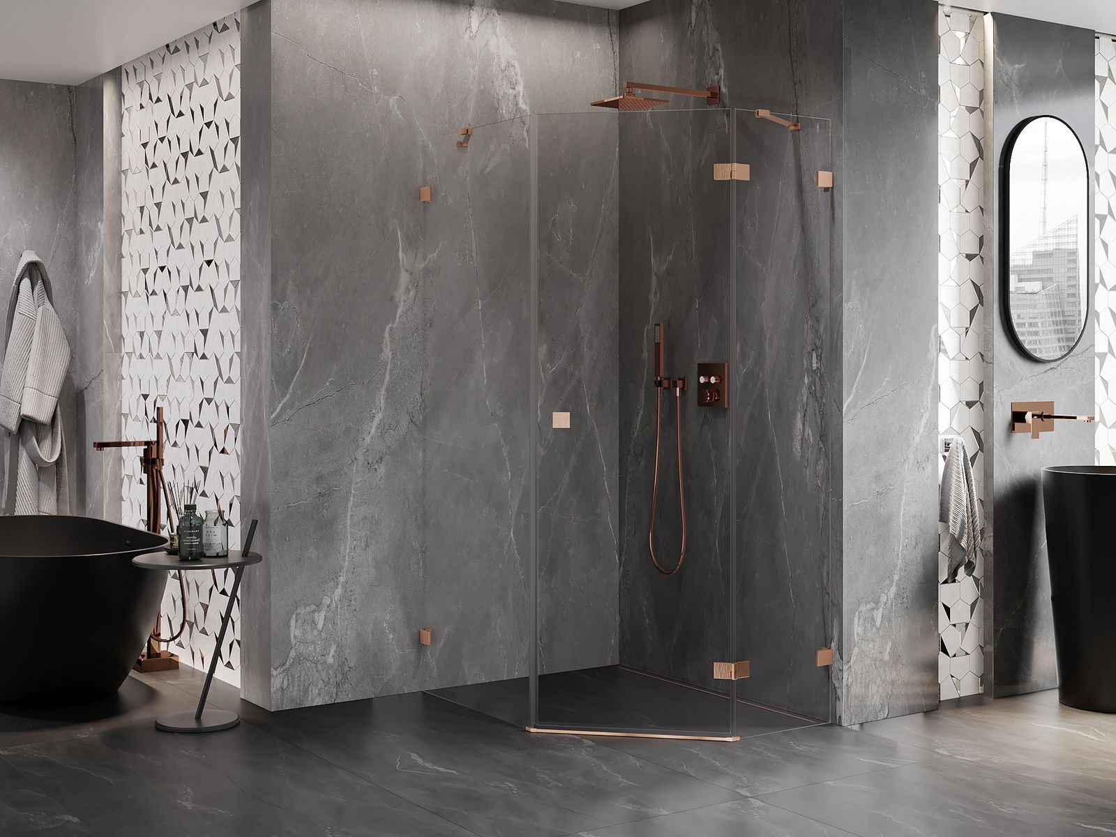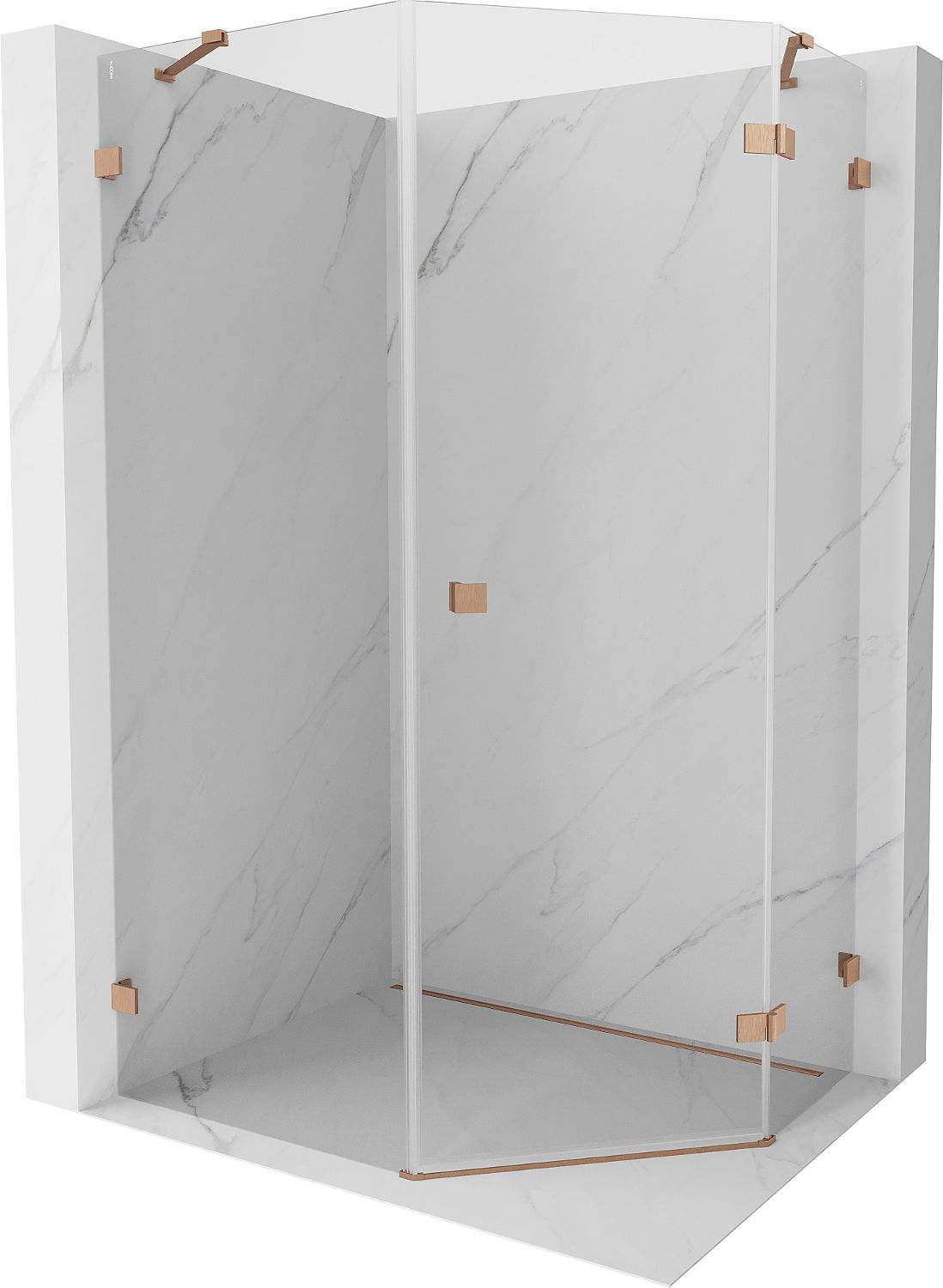 Mexen Lunar päťuholníková sprchová kabína pravá 80 x 90 cm, priehľadná, brúsená meď - 831-080P-090L-65-00-P