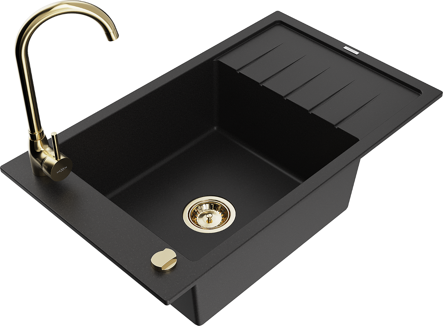 Mexen Elias granitový drez 1-komorový s odkvapkávačom a kuchynskou batériou Telma, čierny - 6511-77-670200-50