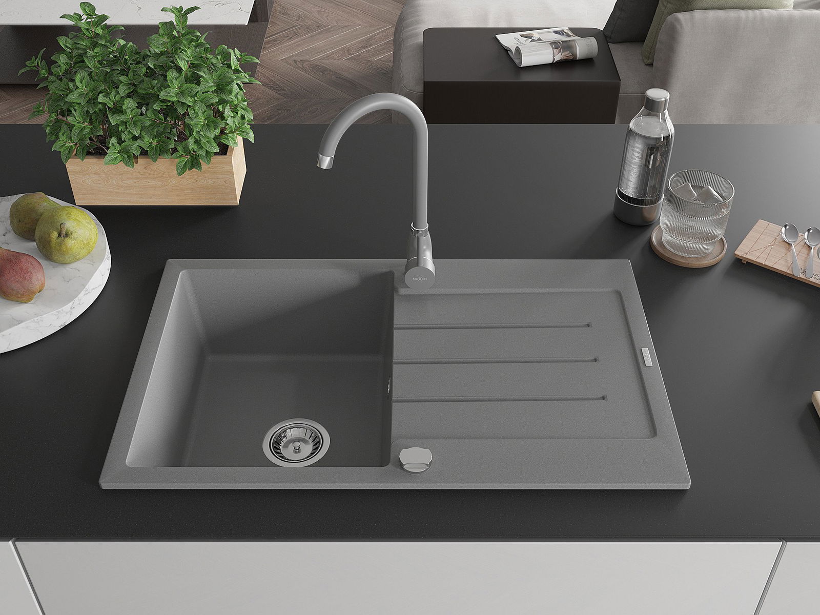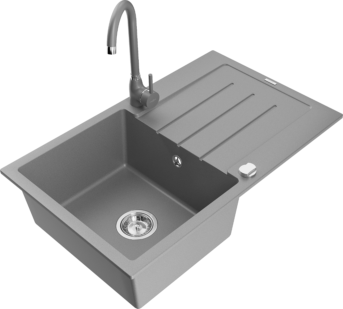 Mexen Bruno žulový drez s 1-komorou a odkapávačom a kuchynskou batériou Telma, sivý - 6513-71-670200-71