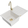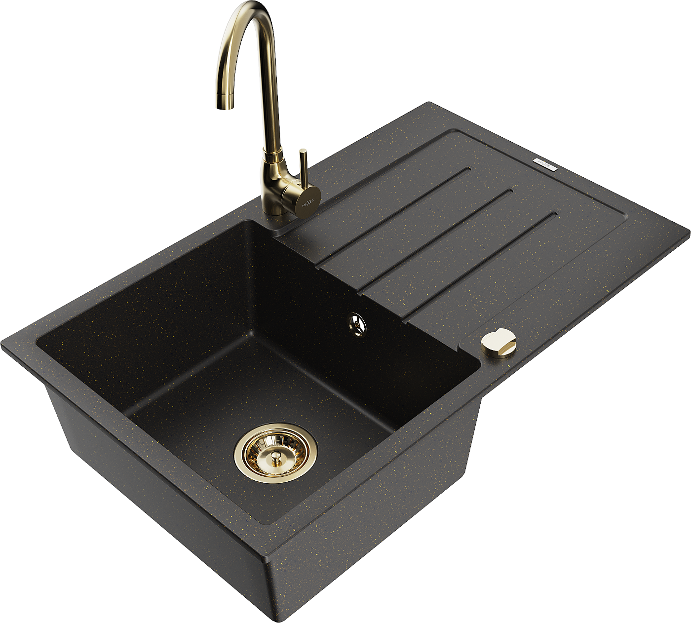 Mexen Bruno žulový drez 1-komorový s odkvapkávačom a kuchynskou batériou Telma, čierny/zlatý - 6513-75-670200-50