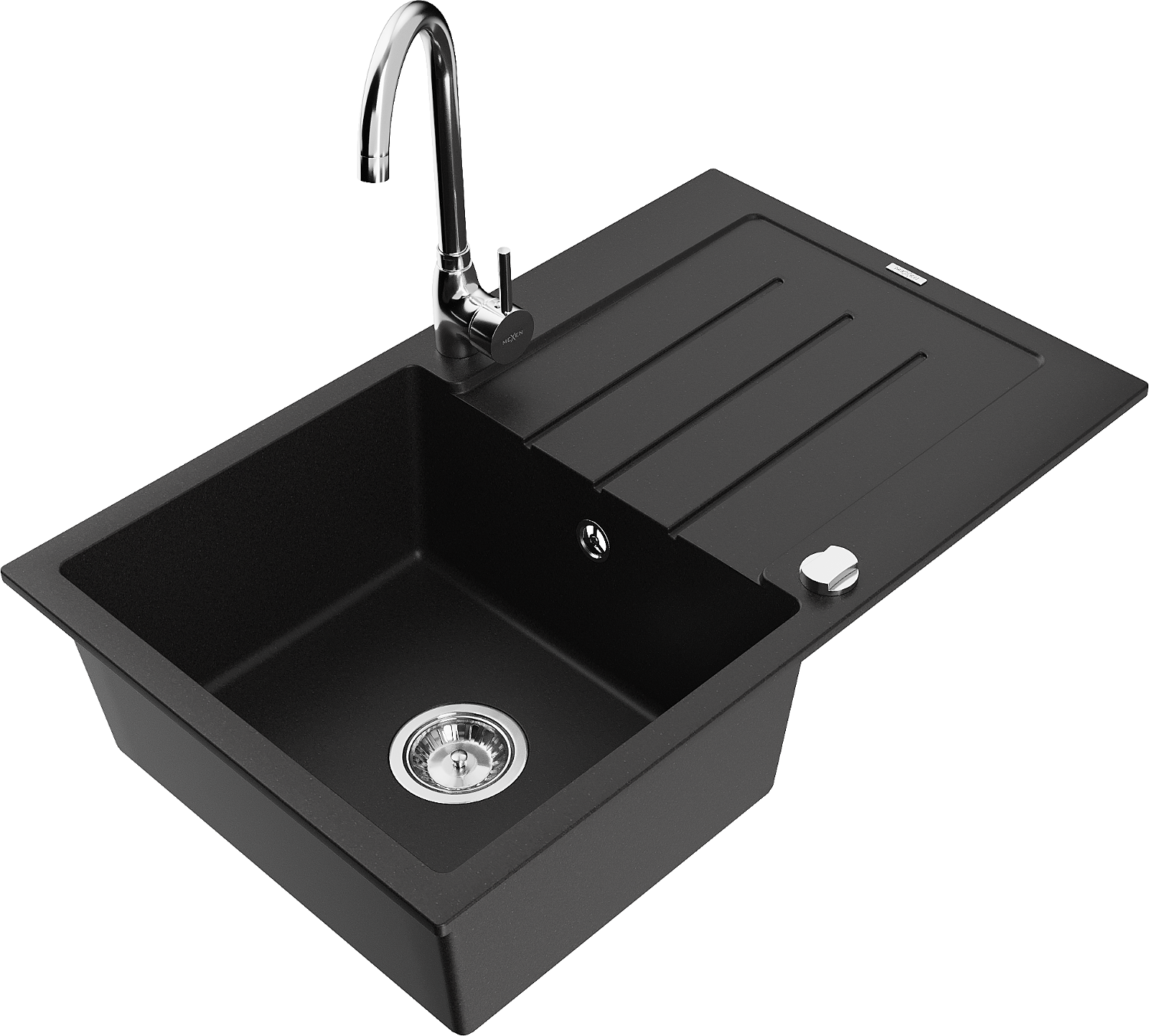 Mexen Bruno žulový drez s jednou komorou s odkvapkávačom a kuchynskou batériou Telma, čierny - 6513-77-670200-00