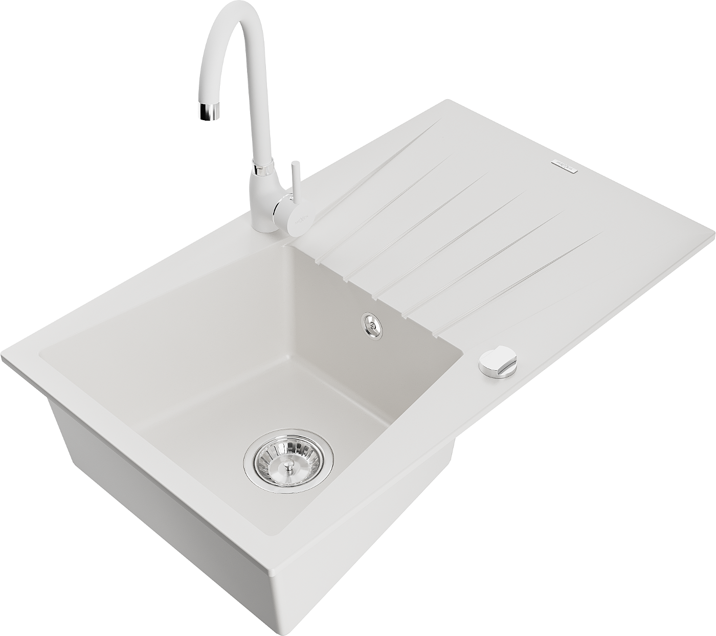 Mexen Cesar granitový drez s 1-komorou s odkvapkávačom a kuchynskou batériou Telma, biely - 6514-20-670200-20