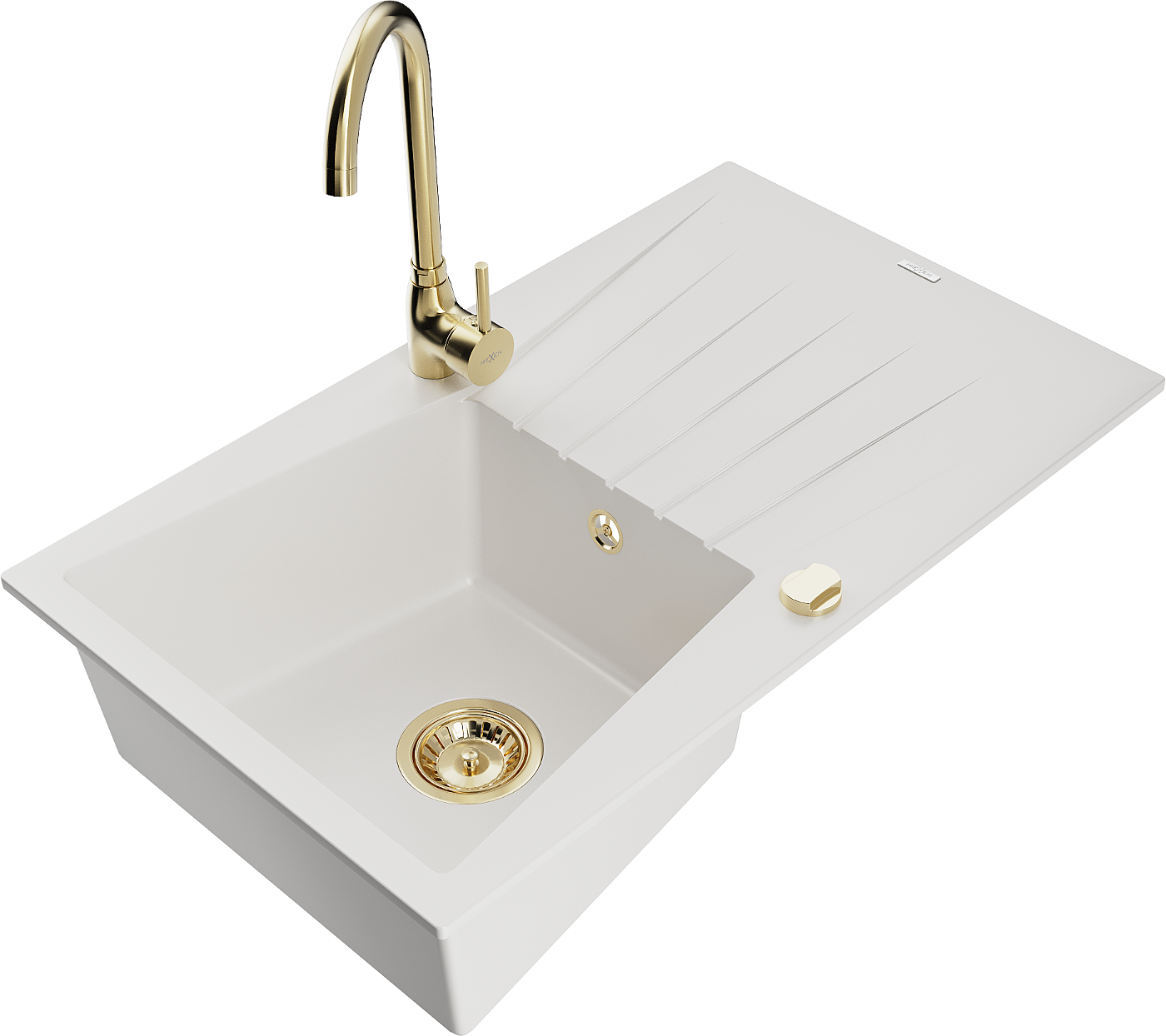 Mexen Cesar granitový drez 1-komorový s odkvapkávačom a kuchynskou batériou Telma, biely - 6514-20-670200-50