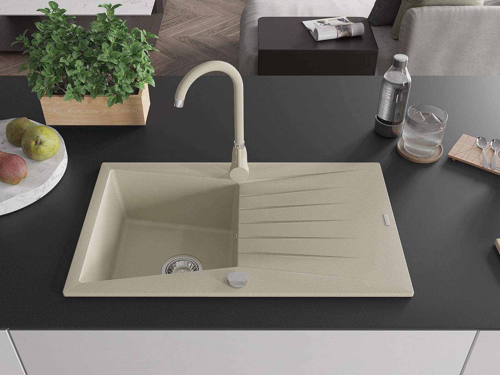 Povrch umývadla je odolný voči škvrnám a sfarbeniu, vďaka čomu sa ľahko čistí a zachováva si svoju farbu po dlhú dobu. Estetický a prakticky dopĺňajúci každú kuchyňu.