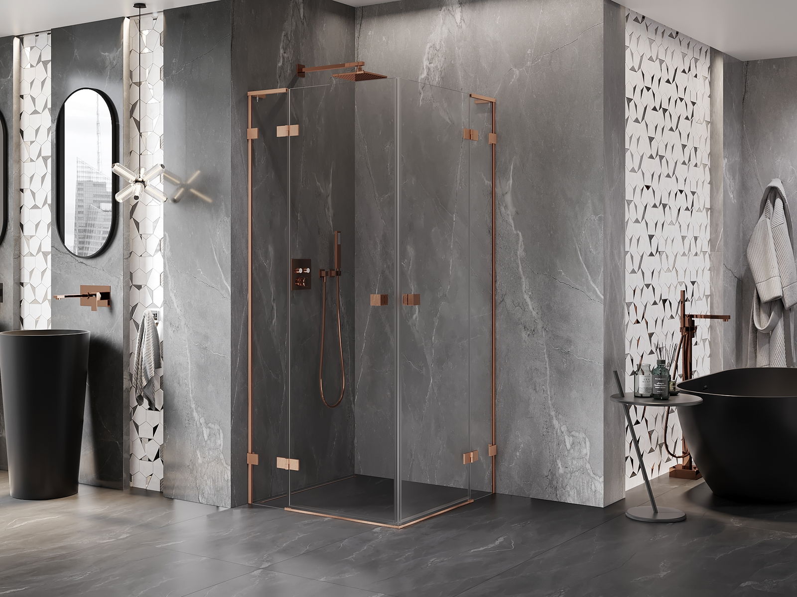 Mexen Lunar L Duo sprchovací kút sklopný 75 x 75 cm, transparentný, brúsená meď - 834L-075L-075P-65-00