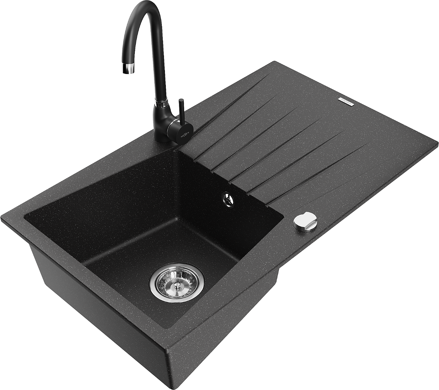 Mexen Cesar granitový drez 1-komorový s odkvapkávačom a kuchynskou batériou Telma, čierny/strieborný - 6514-73-670200-70