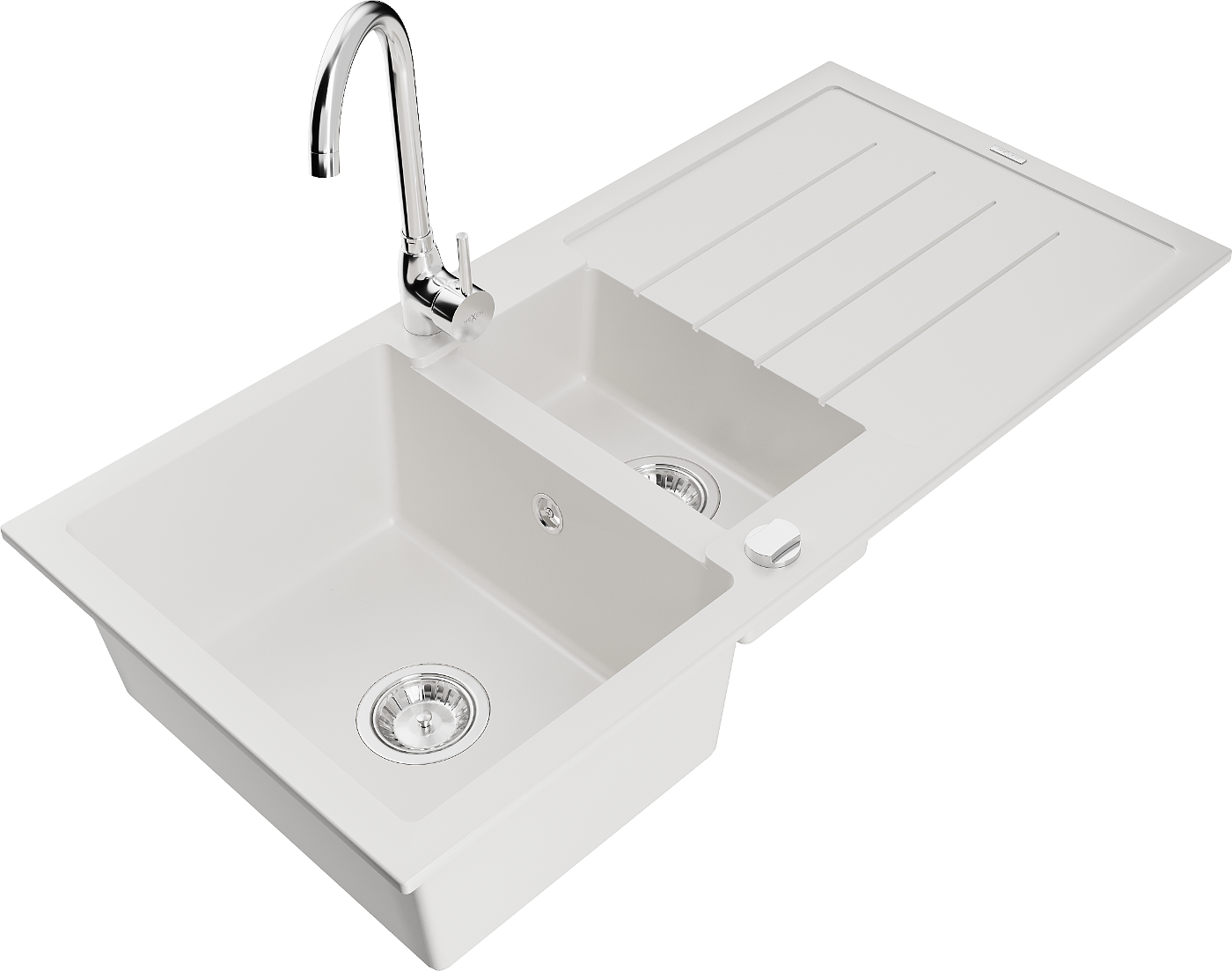 Mexen Andres granitový kuchynský drez 1,5-komorový s odkvapkávačom a kuchynskou batériou Telma, biela - 6515-20-670200-00