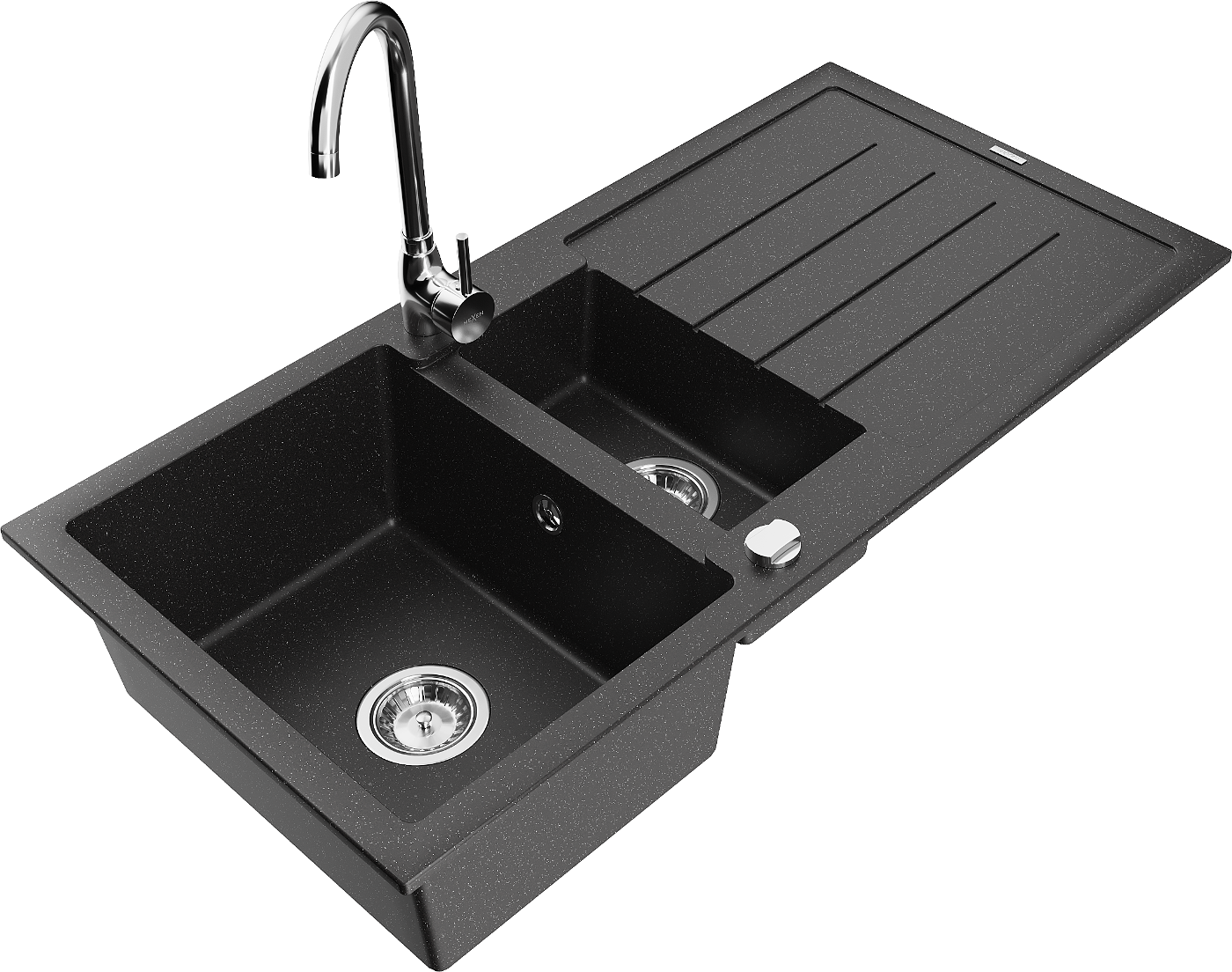 Mexen Andres žulový drez 1,5-komorový s odkvapkávačom a kuchynskou batériou Telma, čierny/strieborný - 6515-73-670200-00