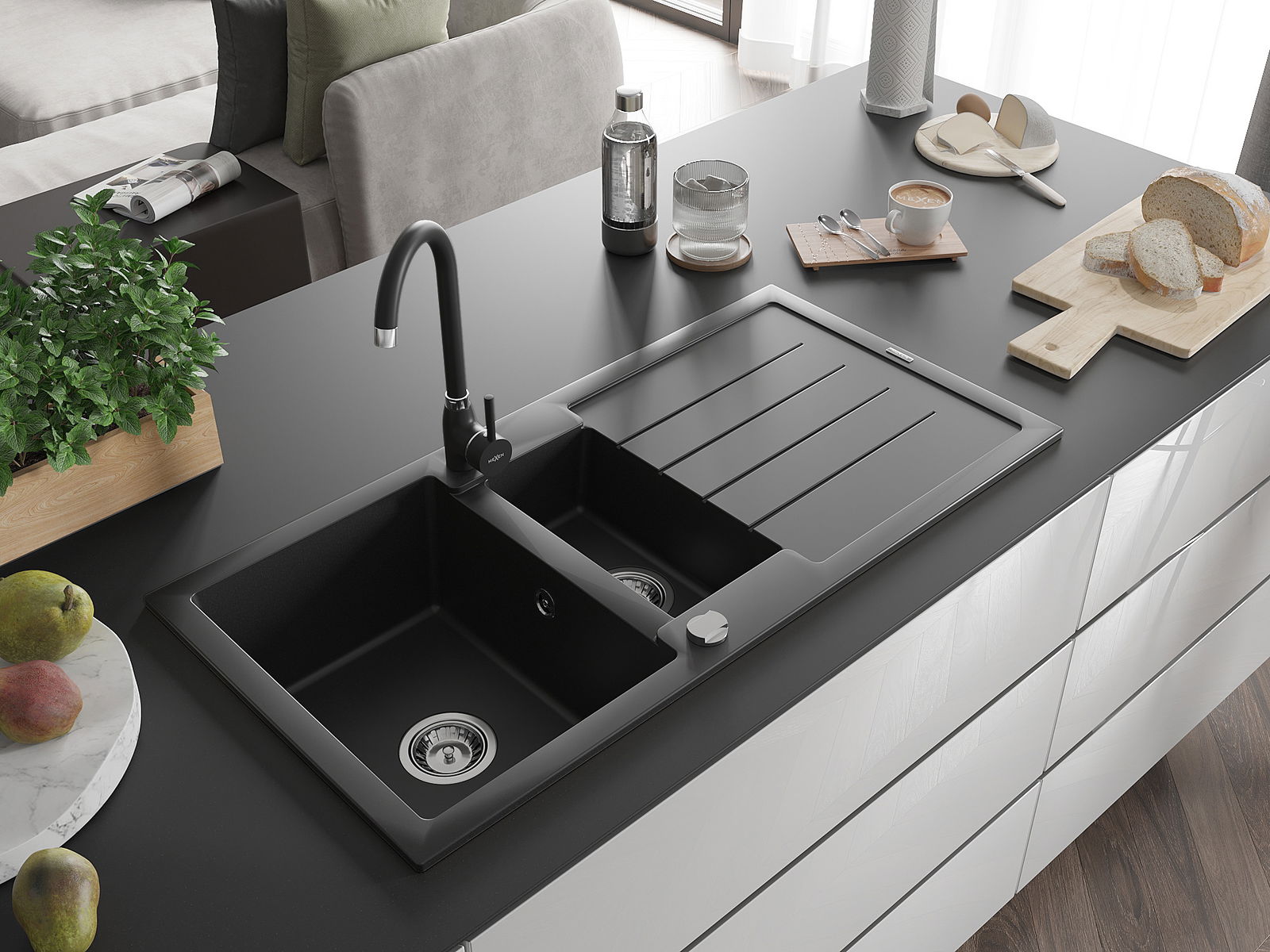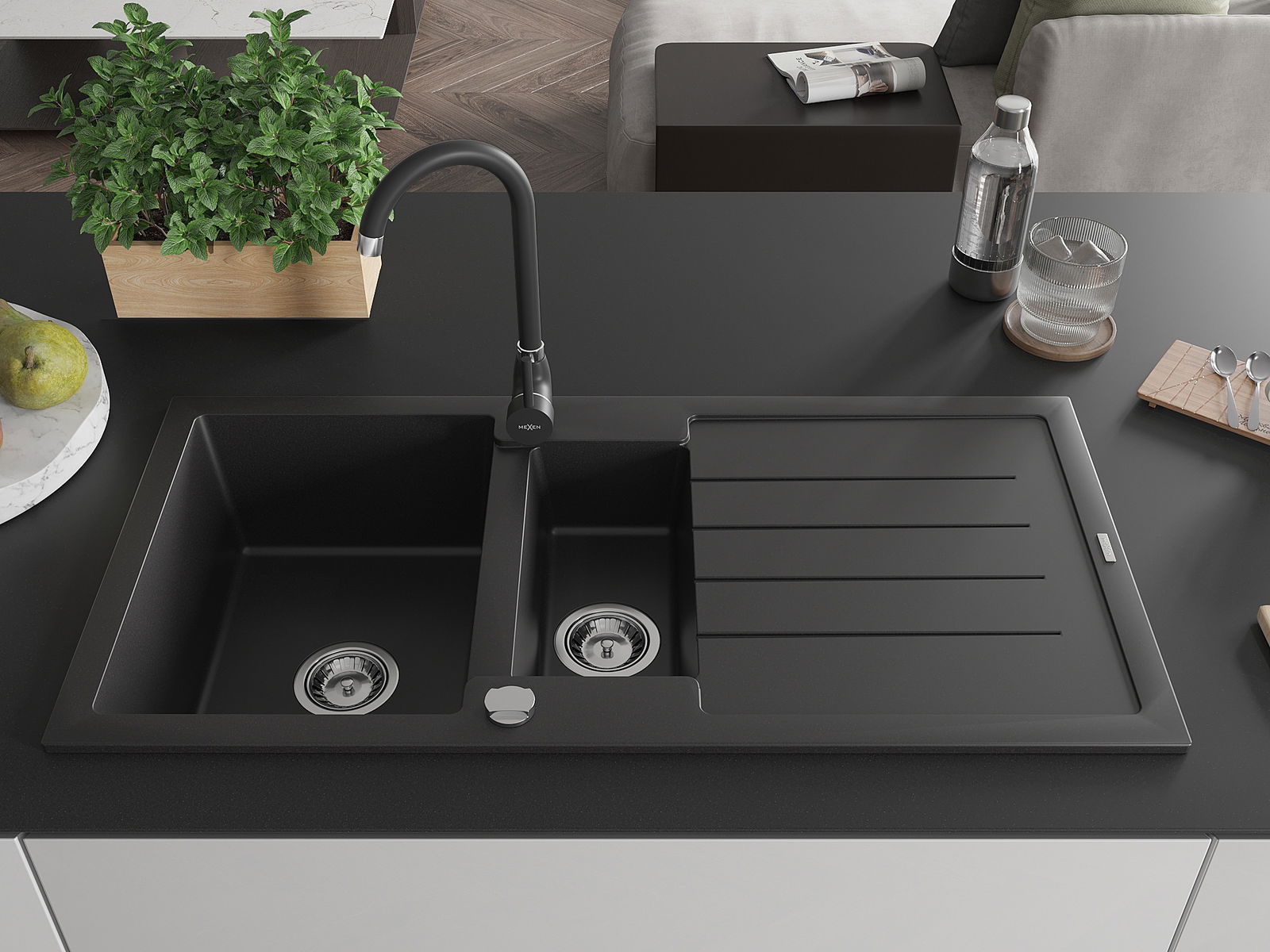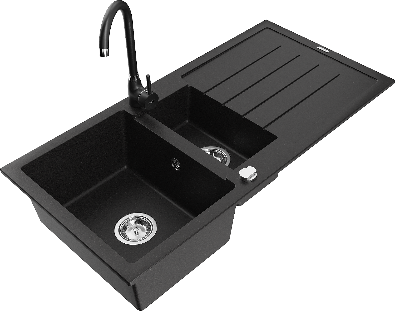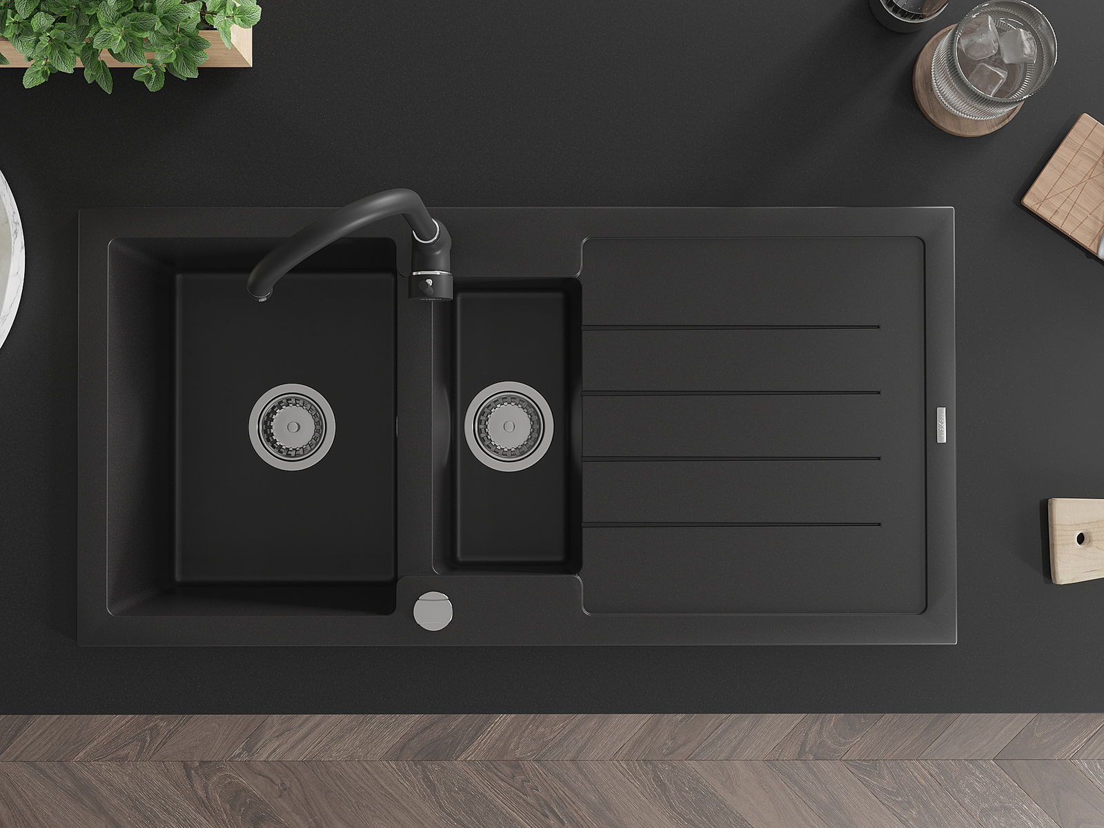 Mexen Andres žulový drez 1,5-komorový s odkvapkávačom a kuchynskou batériou Telma, čierny - 6515-77-670200-70