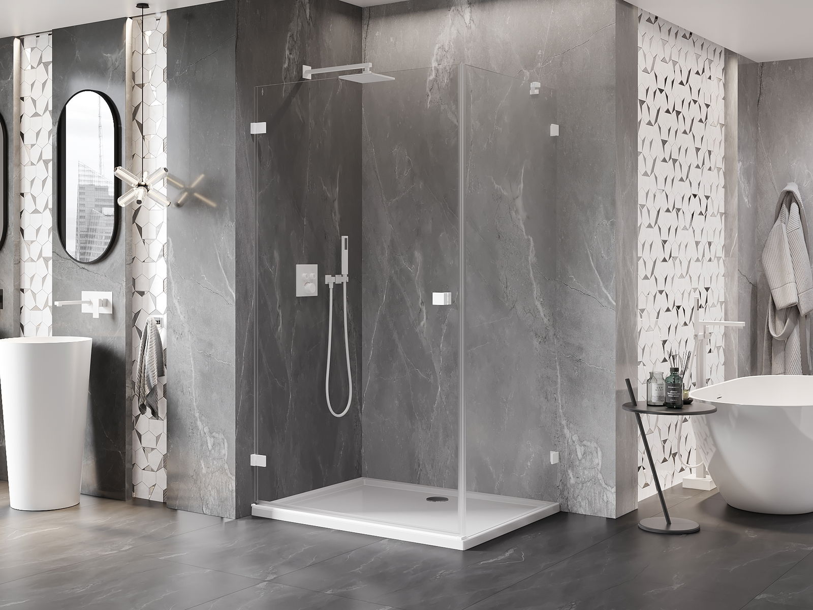 Praktická a pohodlná rukoväť je vyrobená z odolného a pevného kovu. Moderný tvar v kombinácii s povrchovou úpravou prispôsobenou farbe profilov dodáva celku moderný a štýlový vzhľad, zdôrazňujúc estetiku každej kúpeľne.