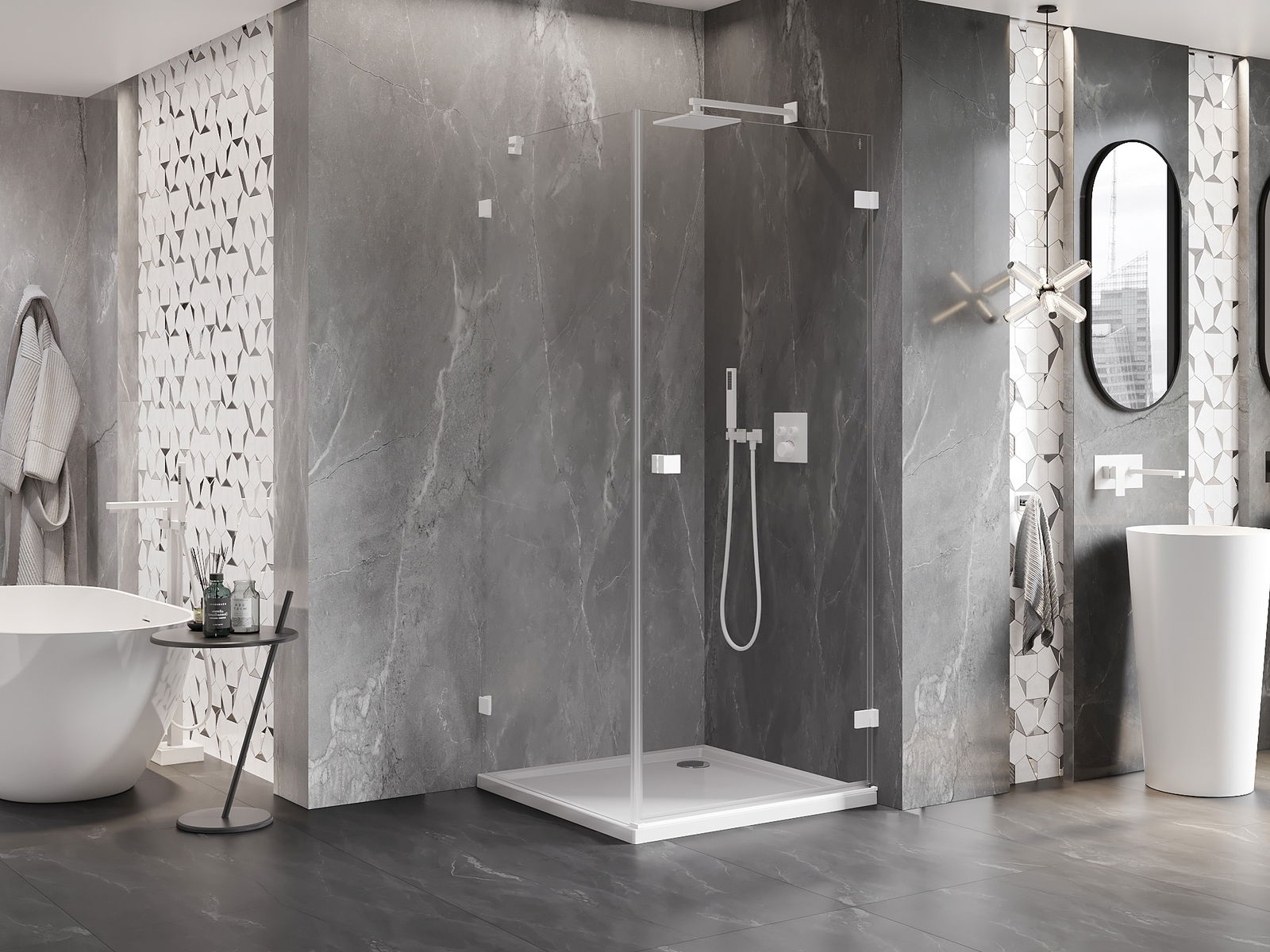 Praktická a pohodlná rukoväť je vyrobená z odolného a pevného kovu. Moderný tvar v kombinácii s povrchovou úpravou prispôsobenou farbe profilov dodáva celku moderný a štýlový vzhľad, zdôrazňujúc estetiku každej kúpeľne.