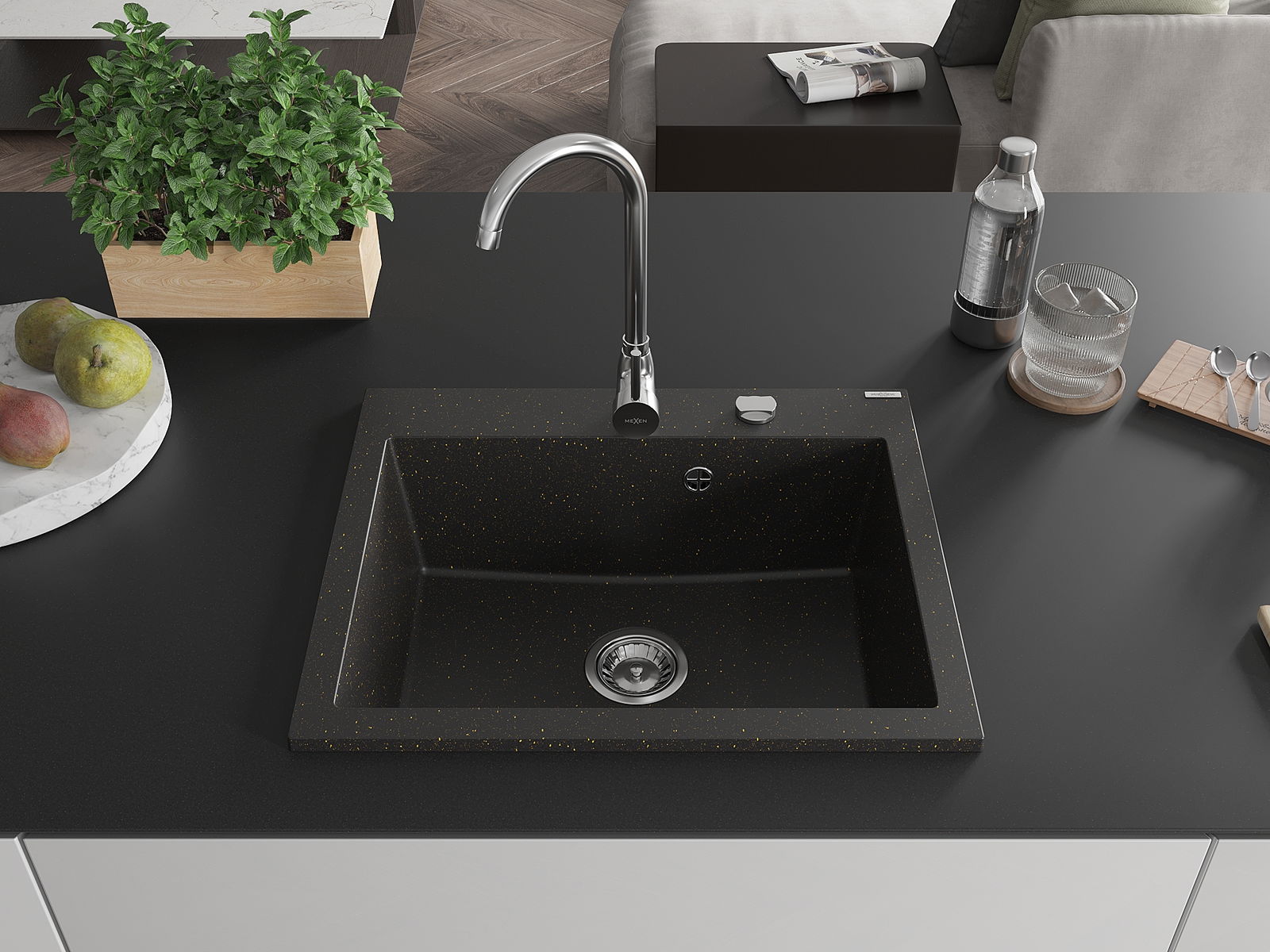 Mexen Elix granitový kuchynský drez 1-komorový 600 x 500 mm, čierny/zlatý metalik, sifón chróm - 6525601005-75
