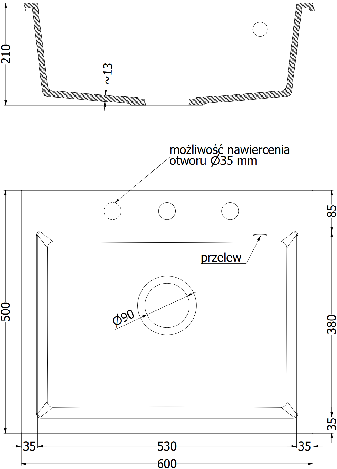 Drez má predfrézovaný otvor s priemerom 35 mm na samostatné prerazenie. Môže sa využiť napríklad na montáž dávkovača na tekutinu, ktorý eliminuje prítomnosť plastových fliaš v kuchyni a pridáva jej elegantné dokončenie.