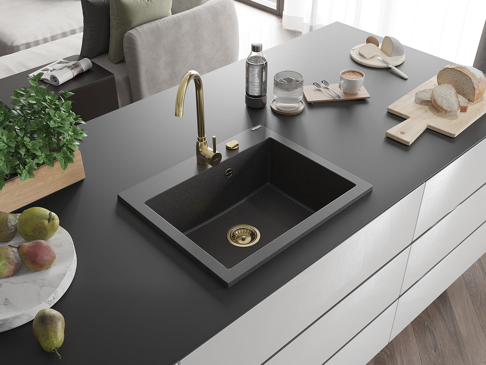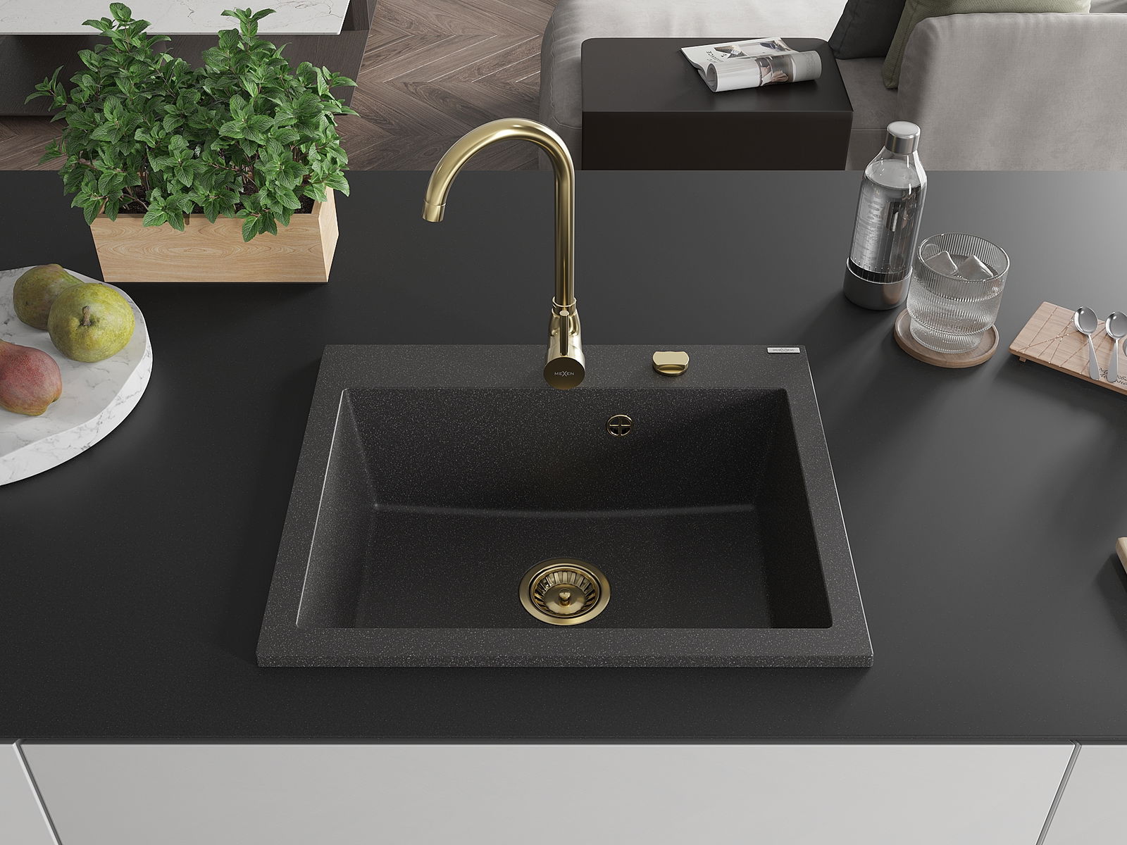 Mexen Elix granitový drez 1-komorový 600 x 500 mm, čierny škvrnitý, zlatý sifón - 6525601005-76-G