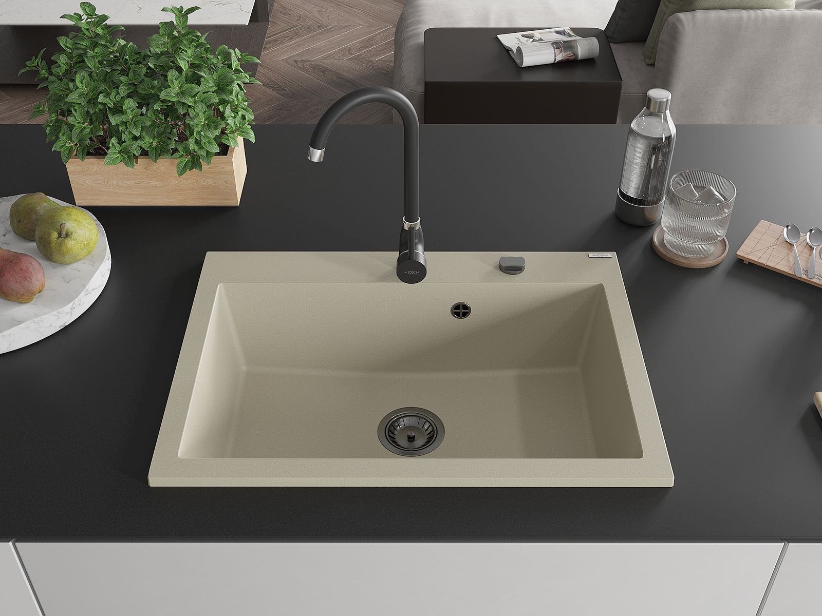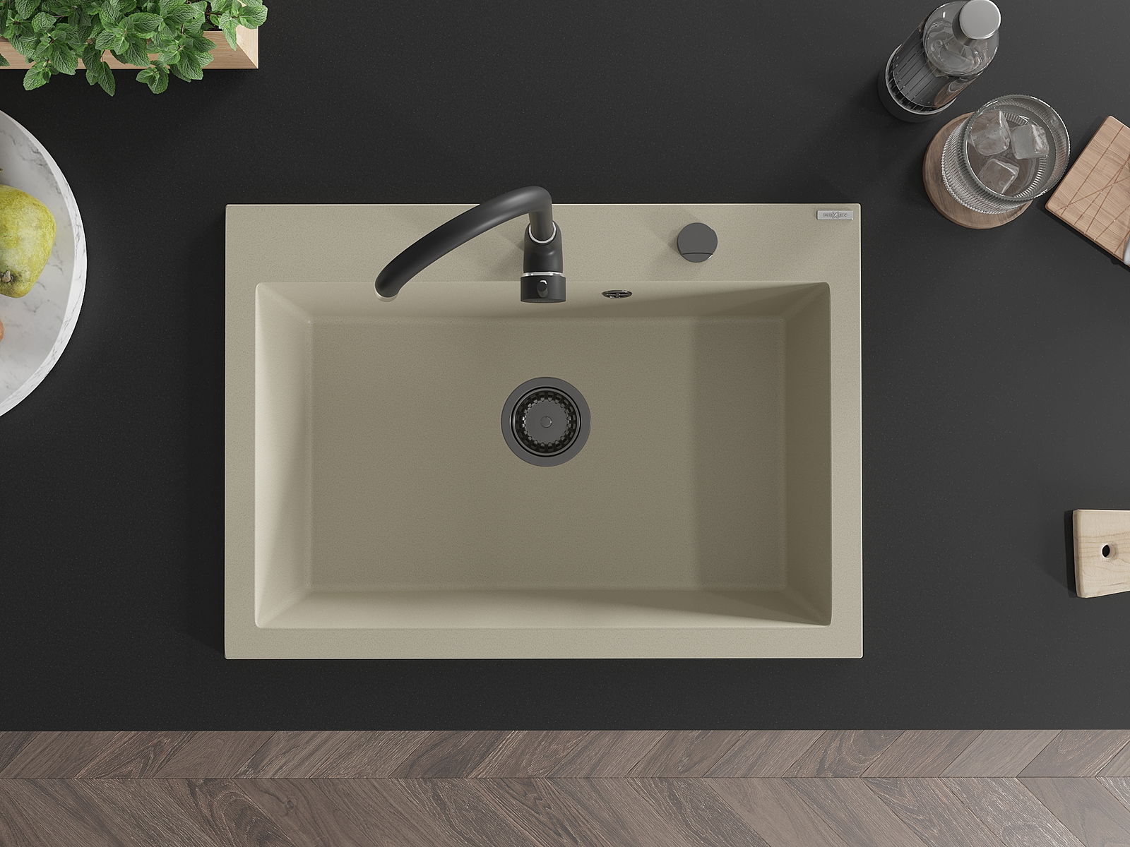 Povrch kuchynského drezu je odolný voči škvrnám a zafarbeniu, vďaka čomu sa ľahko udržiava a zachováva svoju farbu počas dlhého obdobia používania. Estetický a praktický doplnok pre každú kuchyňu.
