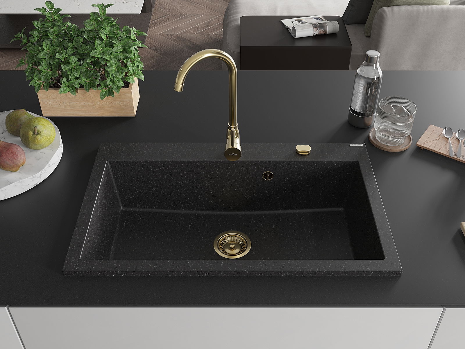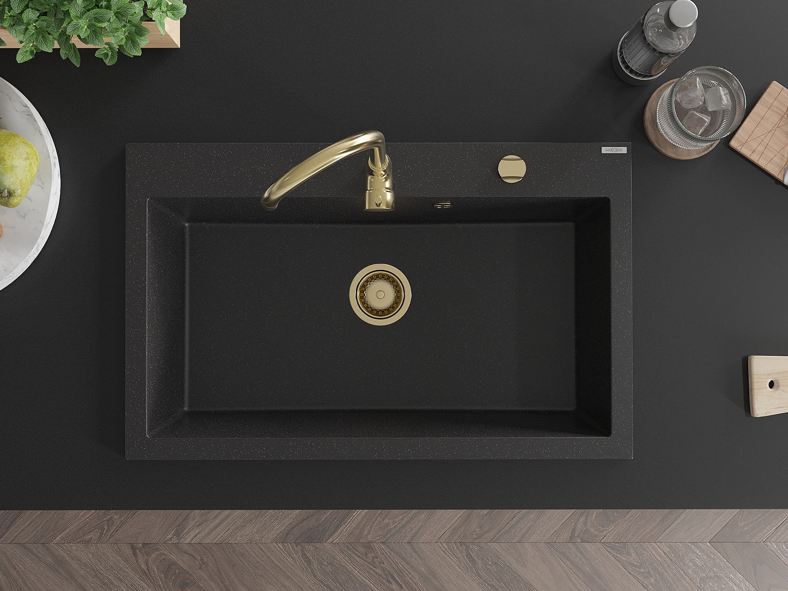 Mexen Elix žulový kuchynský drez 1-komorový 800 x 500 mm, čierny/strieborný metalik, sifón zlatý - 6527801005-73-G