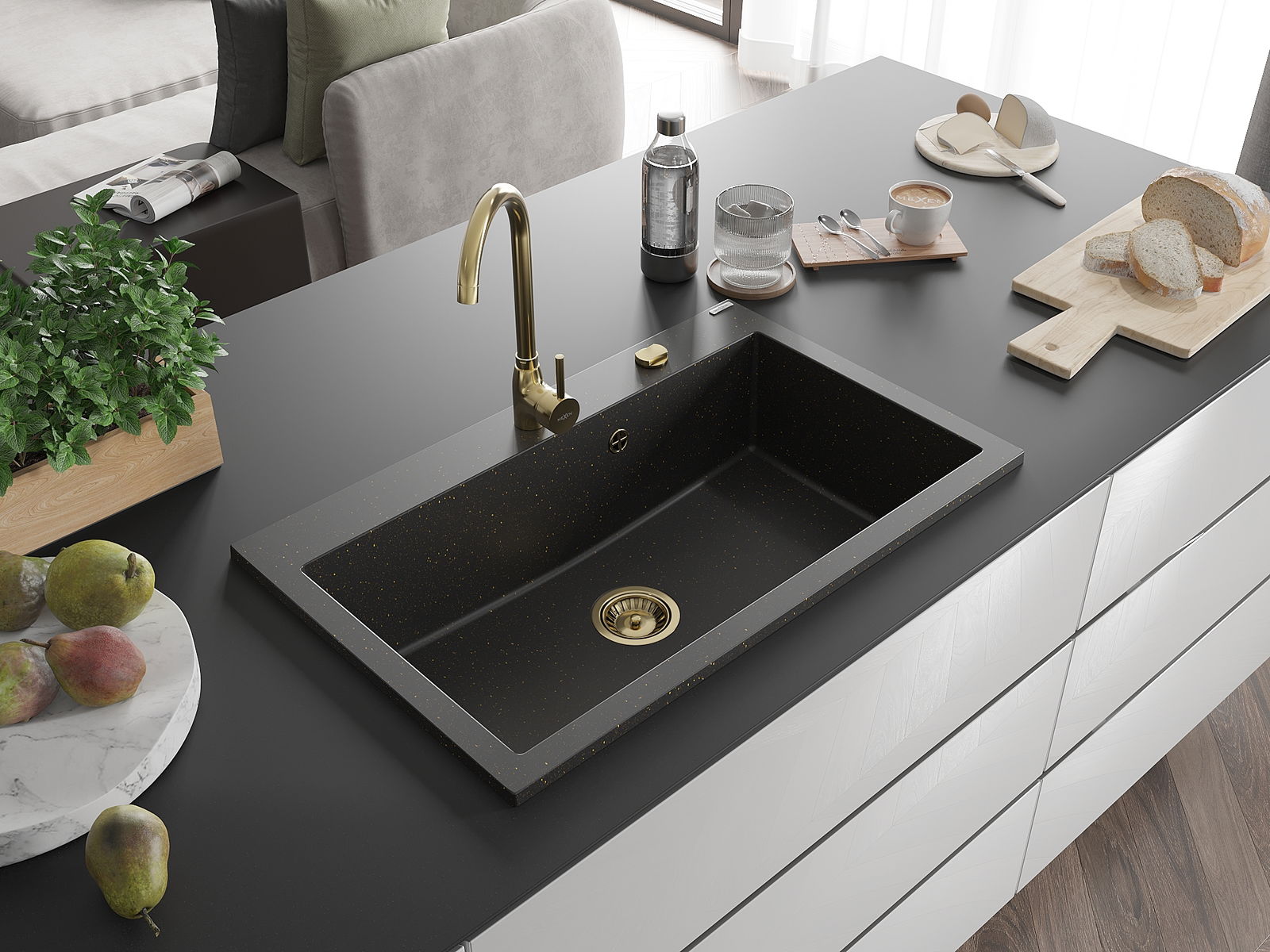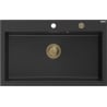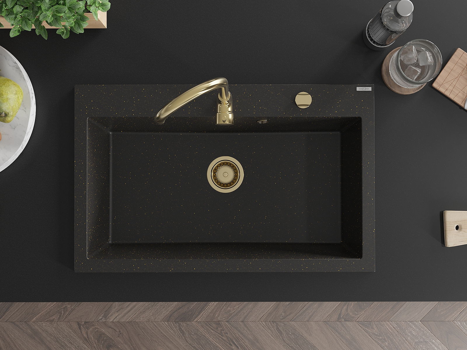 Mexen Elix granitový kuchynský drez 1-komorový 800 x 500 mm, čierny/zlatý metalik, zlatý sifón - 6527801005-75-G