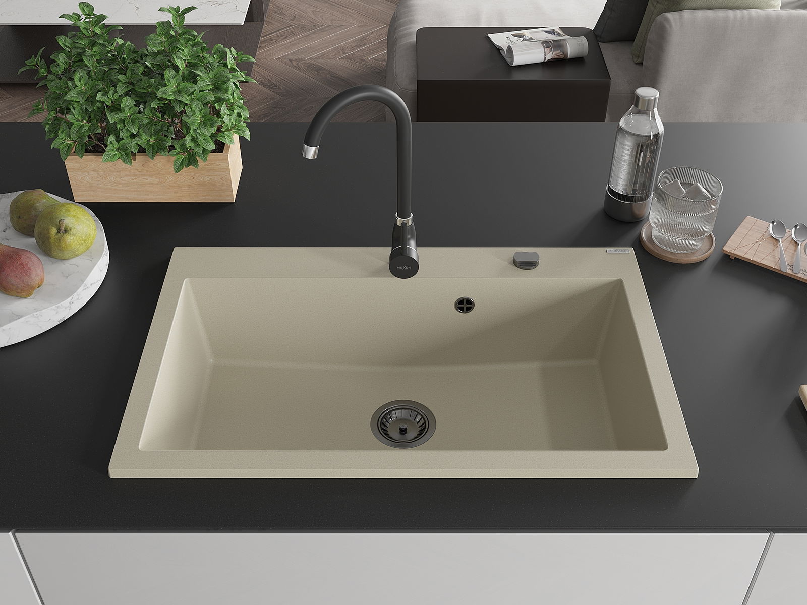 Povrch kuchynského drezu je odolný voči škvrnám a zafarbeniu, vďaka čomu sa ľahko udržiava a zachováva svoju farbu počas dlhého obdobia používania. Estetický a praktický doplnok pre každú kuchyňu.