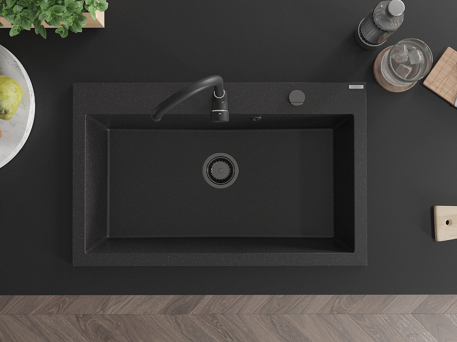 Mexen Elix granitový kuchynský drez 1-komorový 800 x 500 mm, čierny/strieborný metalík, čierny sifón - 6527801005-73-B
