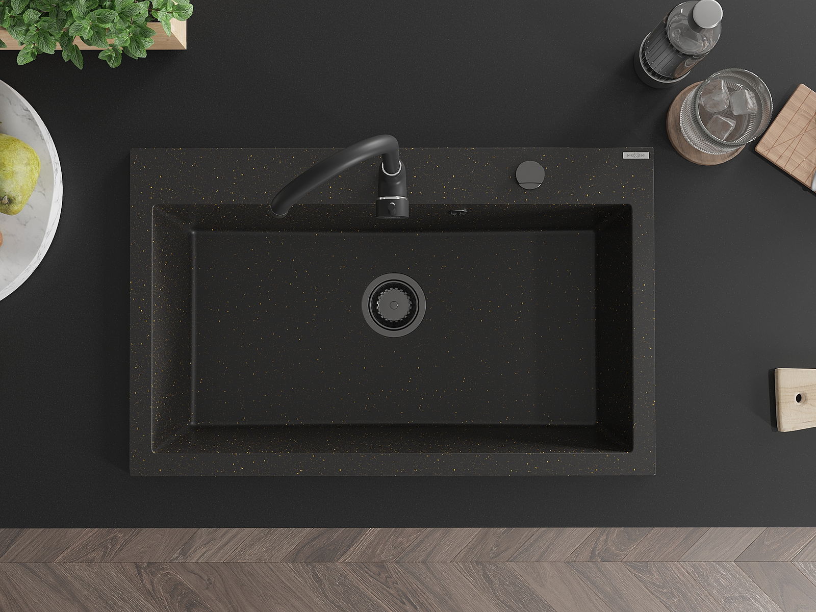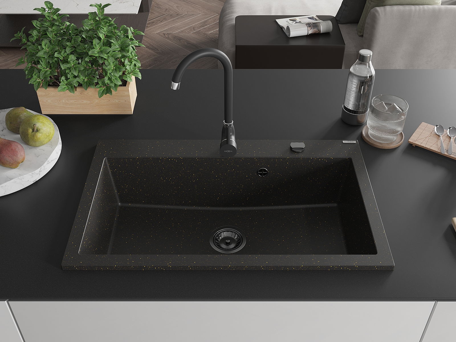 Mexen Elix kuchynský drez z granitu 1-komorový 800 x 500 mm, čierny/zlatý metalik, čierny sifón - 6527801005-75-B