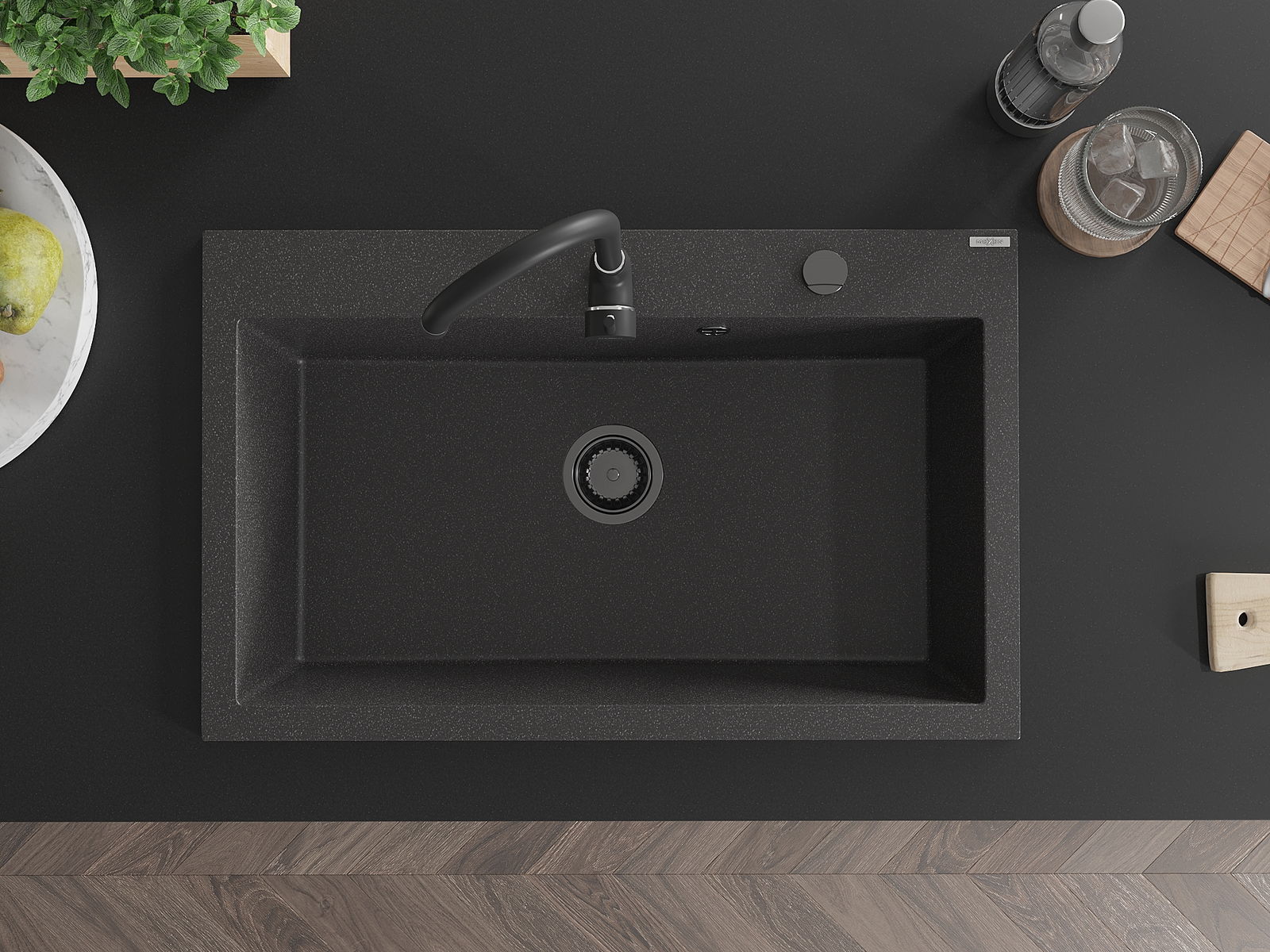 Mexen Elix granitový drez 1-komorový 800 x 500 mm, čierny škvrnitý, čierny sifón - 6527801005-76-B