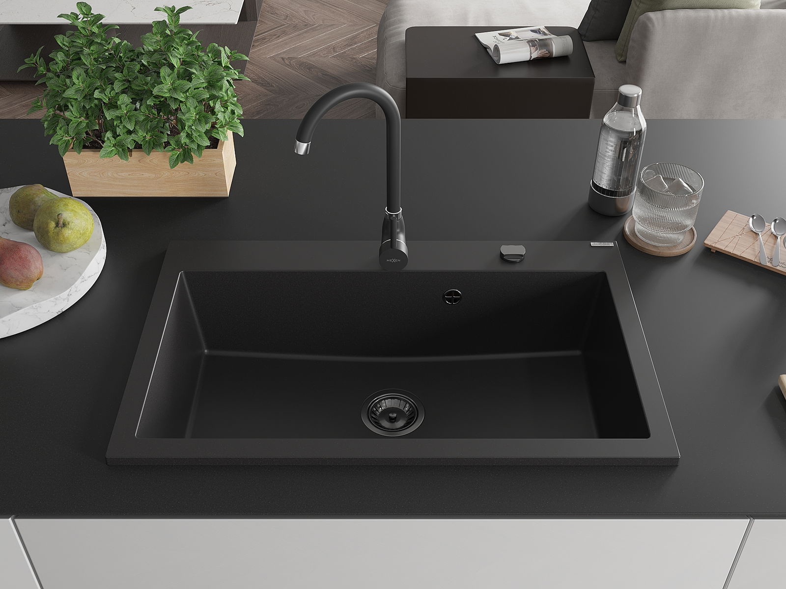 Mexen Elix Granitový drez s 1 komorou 800 x 500 mm, čierny, čierny sifón - 6527801005-77-B