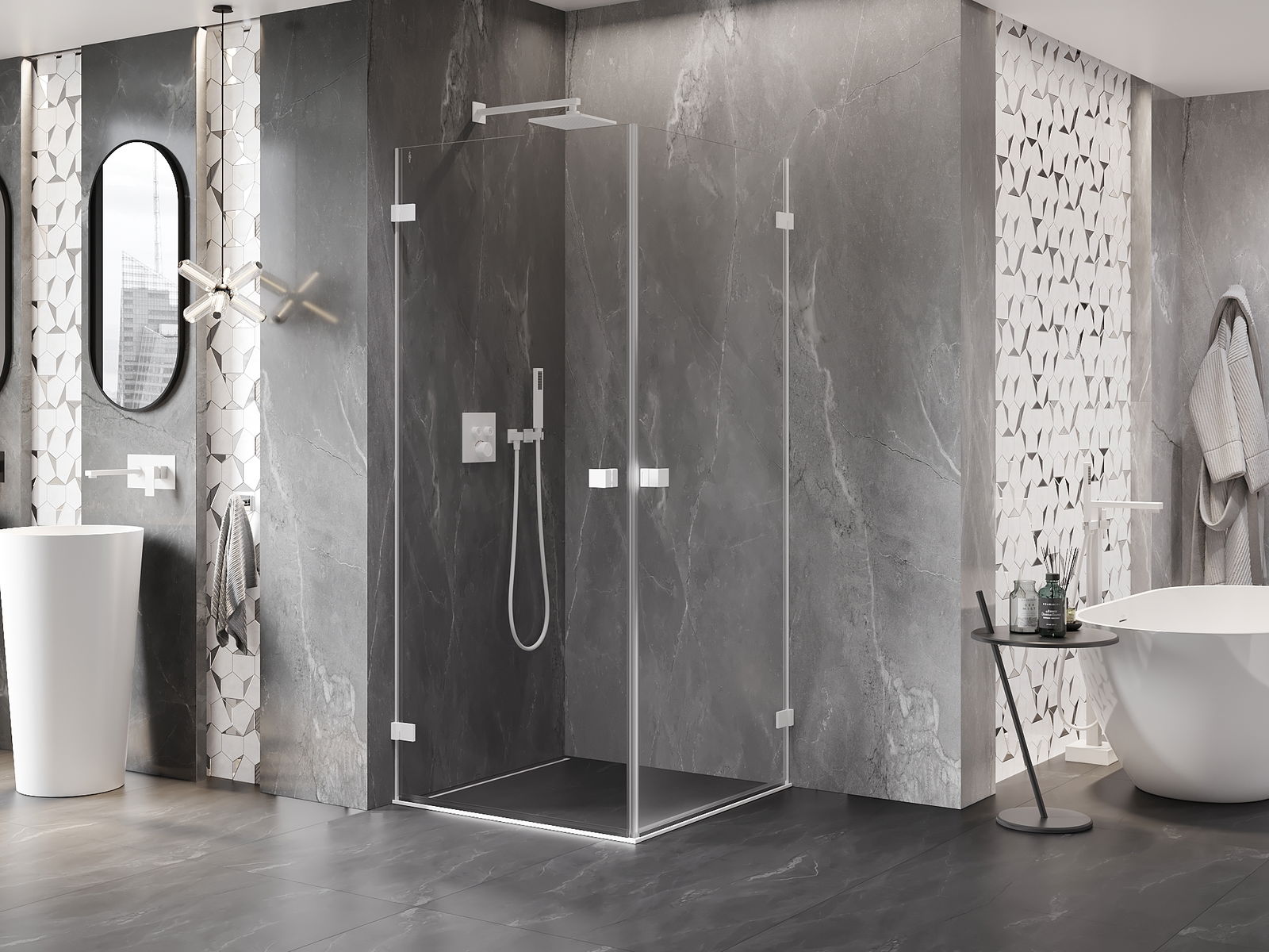 Praktická a pohodlná rukoväť je vyrobená z odolného a pevného kovu. Moderný tvar v kombinácii s povrchovou úpravou prispôsobenou farbe profilov dodáva celku moderný a štýlový vzhľad, zdôrazňujúc estetiku každej kúpeľne.
