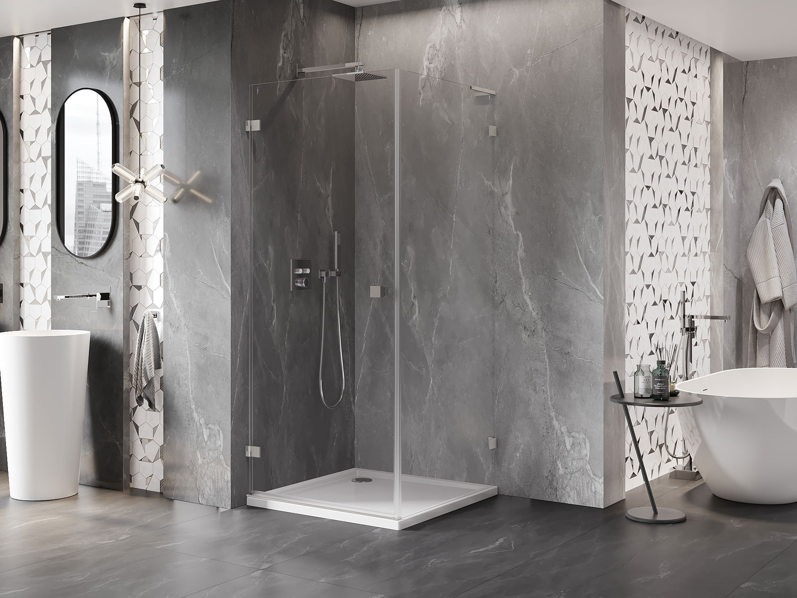 Praktická a pohodlná rukoväť je vyrobená z odolného a pevného kovu. Moderný tvar v kombinácii s povrchovou úpravou prispôsobenou farbe profilov dodáva celku moderný a štýlový vzhľad, zdôrazňujúc estetiku každej kúpeľne.