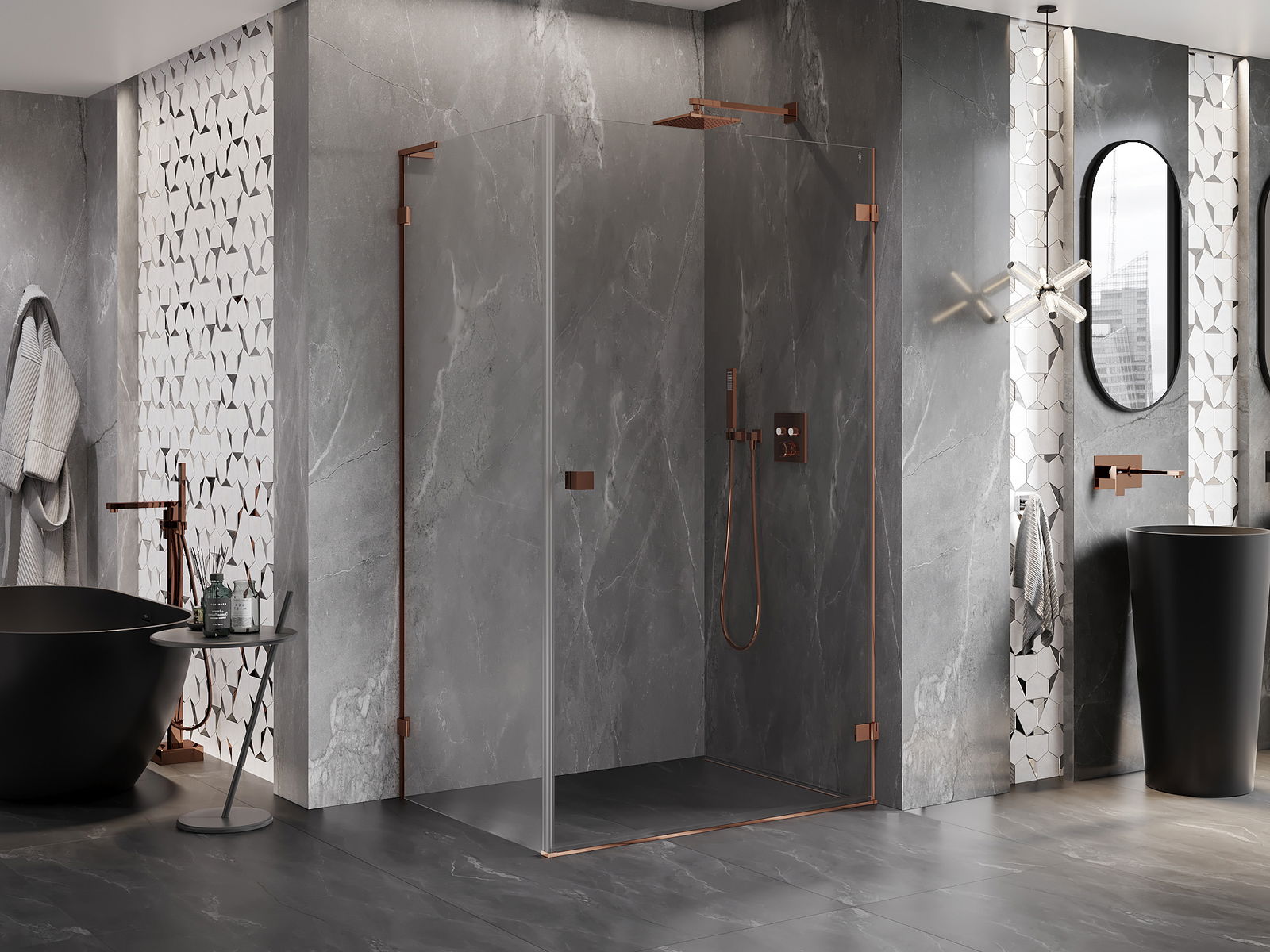 Praktická a pohodlná rukoväť je vyrobená z odolného a pevného kovu. Moderný tvar v kombinácii s povrchovou úpravou prispôsobenou farbe profilov dodáva celku moderný a štýlový vzhľad, zdôrazňujúc estetiku každej kúpeľne.