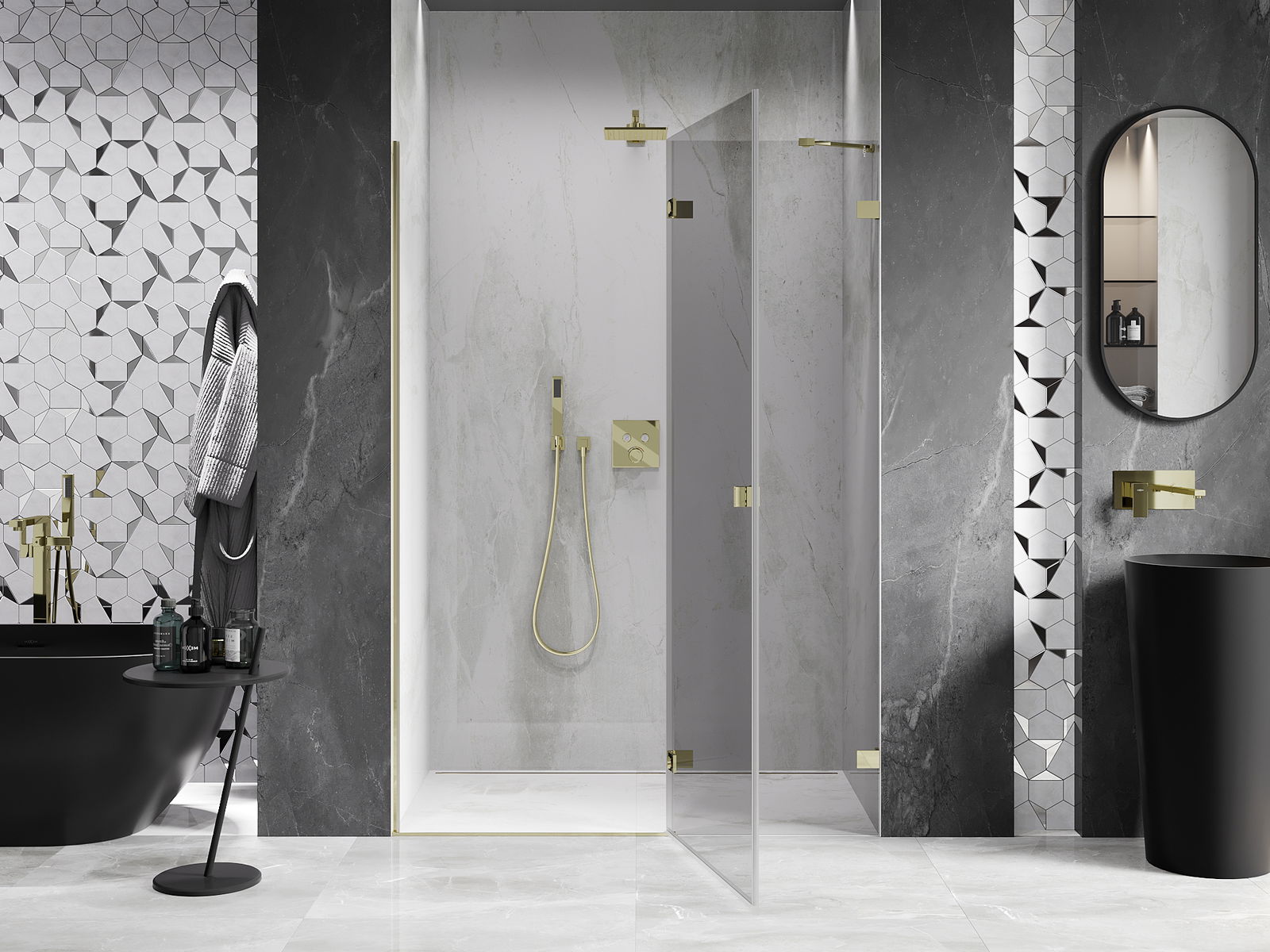 Svorky a závesy boli vyrobené z veľmi odolnej mosadze a navyše vytvárajú zarovnanú tabuľu skla. Je to vynikajúci výber, ktorý spája eleganciu, trvanlivosť a moderný dizajn. Vďaka takýmto riešeniam sprcha získa na estetike a zároveň uľahčujú udržiavanie čistoty.