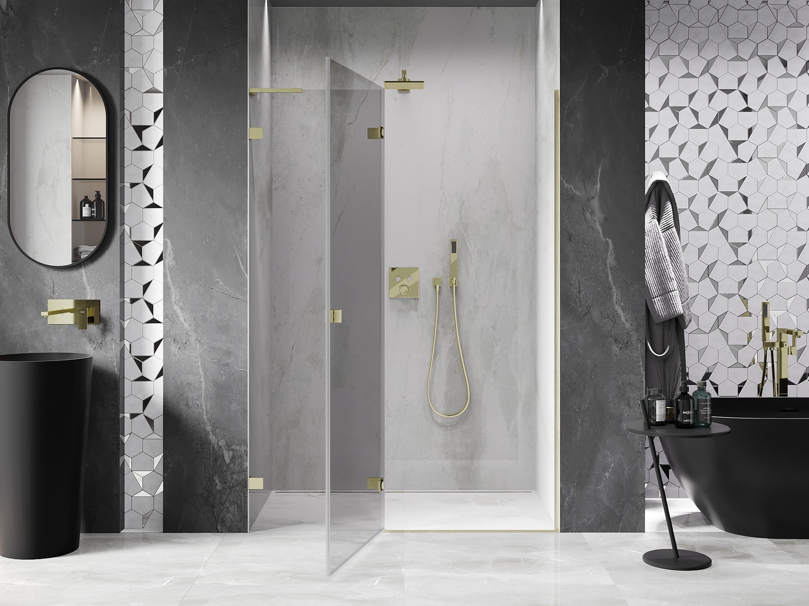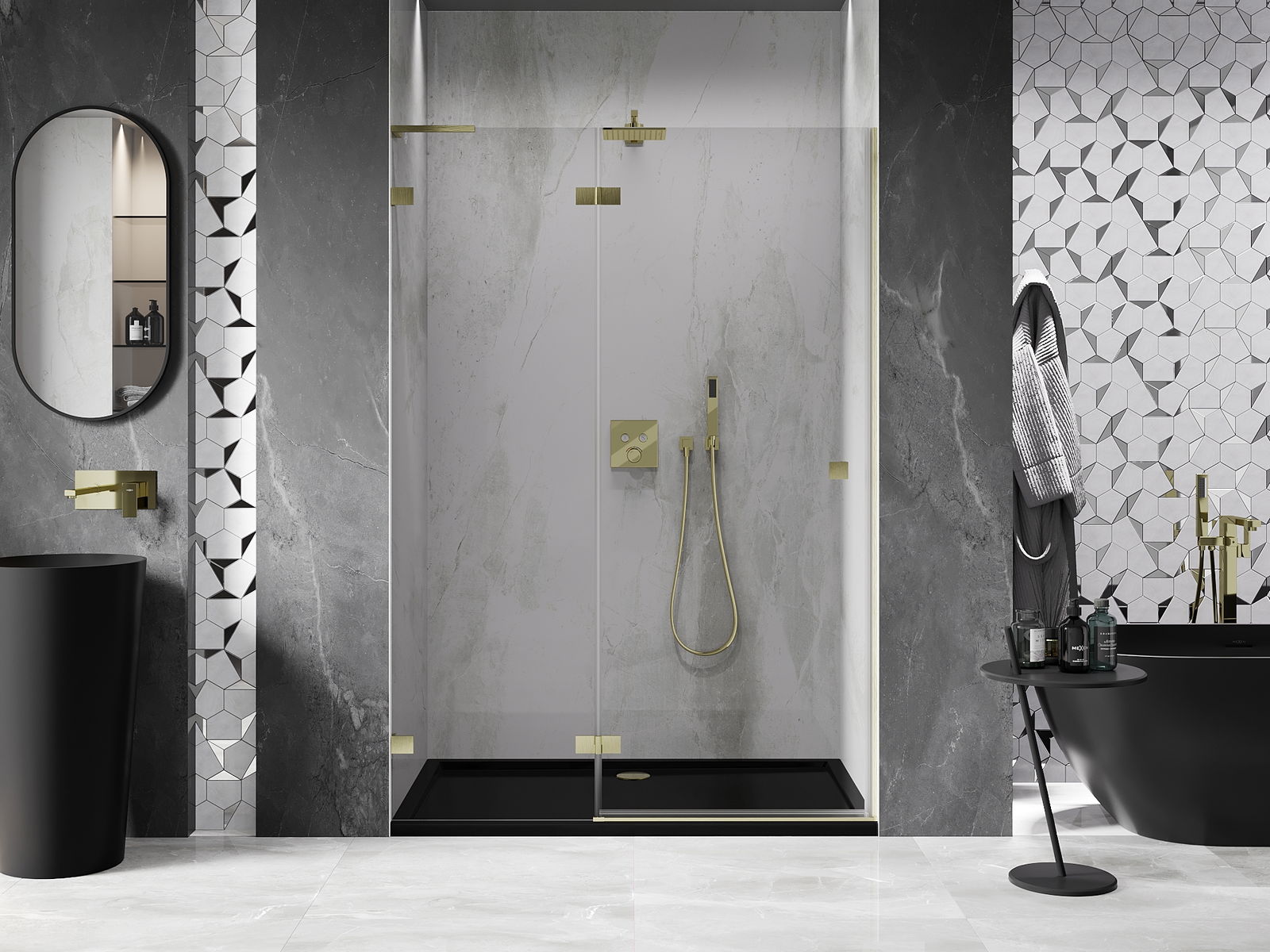 Svorky a závesy boli vyrobené z veľmi odolnej mosadze a navyše vytvárajú zarovnanú tabuľu skla. Je to vynikajúci výber, ktorý spája eleganciu, trvanlivosť a moderný dizajn. Vďaka takýmto riešeniam sprcha získa na estetike a zároveň uľahčujú udržiavanie čistoty.