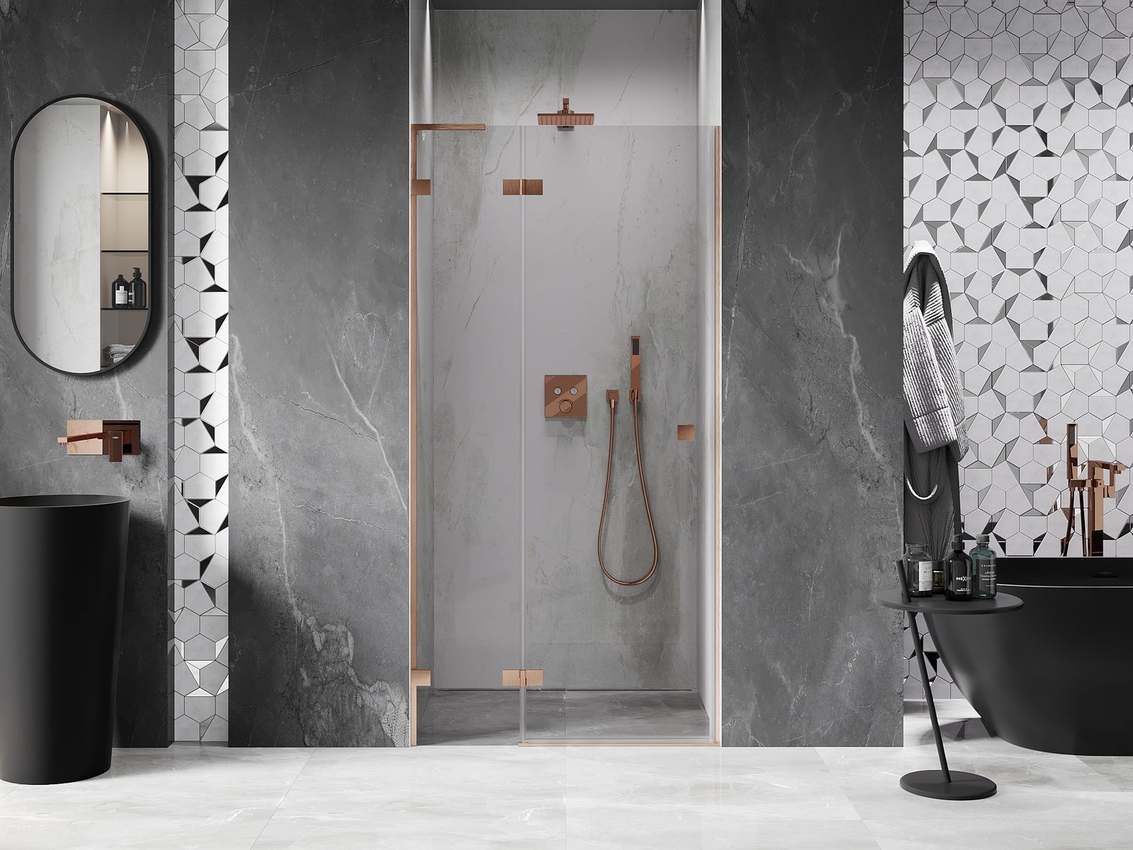 Praktická a pohodlná rukoväť je vyrobená z odolného a pevného kovu. Moderný tvar v kombinácii s povrchovou úpravou prispôsobenou farbe profilov dodáva celku moderný a štýlový vzhľad, zdôrazňujúc estetiku každej kúpeľne.