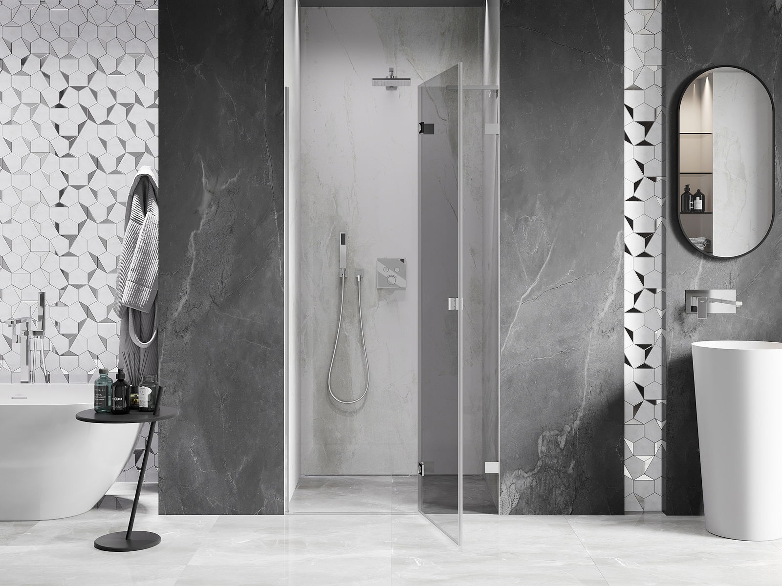 Praktická a pohodlná rukoväť je vyrobená z odolného a pevného kovu. Moderný tvar v kombinácii s povrchovou úpravou prispôsobenou farbe profilov dodáva celku moderný a štýlový vzhľad, zdôrazňujúc estetiku každej kúpeľne.
