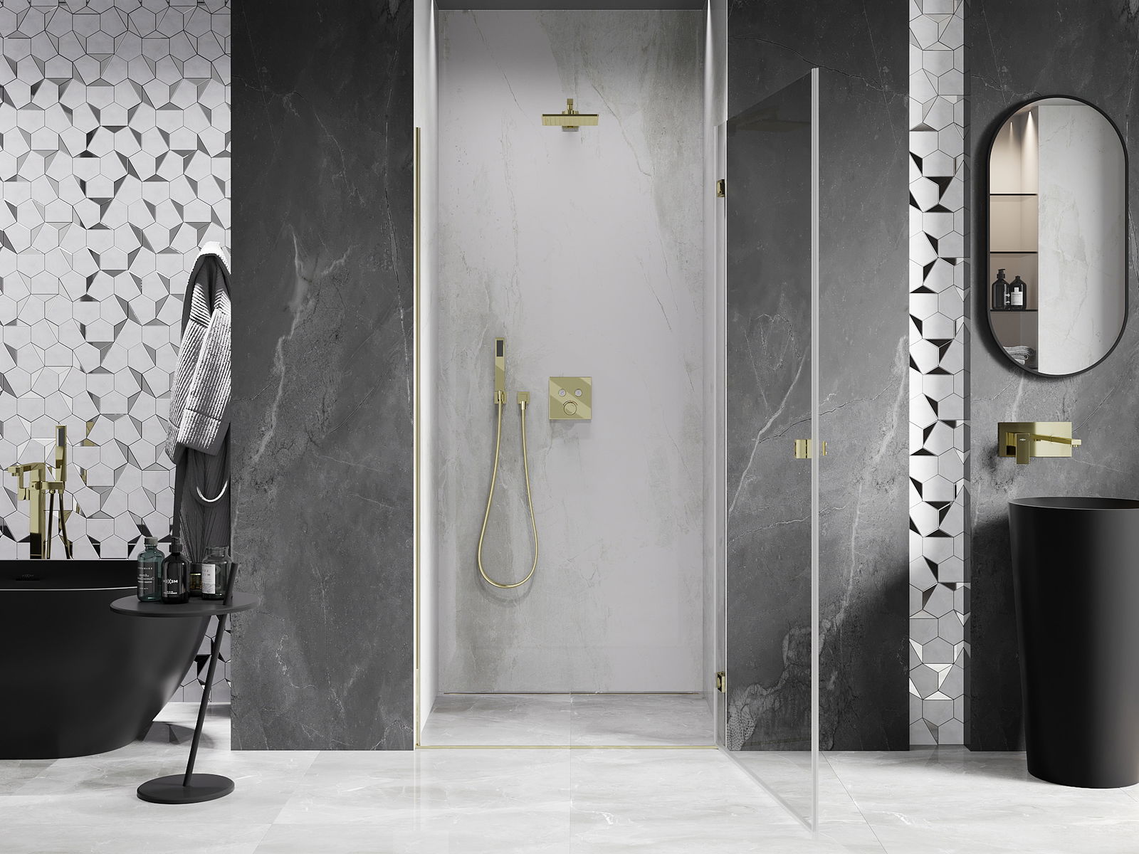 Svorky sú vyrobené z veľmi odolnej mosadze a navyše vytvárajú zapustenú tabuľu skla. Je to vynikajúca voľba, ktorá spája eleganciu, odolnosť a moderný dizajn. Vďaka takýmto riešeniam získa sprcha na estetike a zároveň uľahčuje údržbu čistoty.