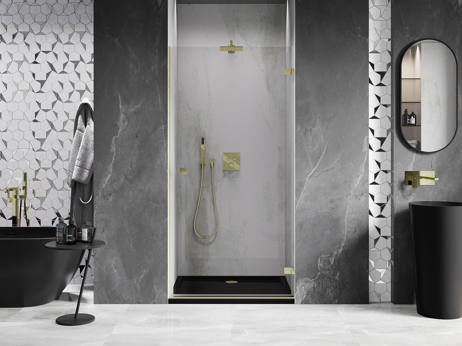 Svorky sú vyrobené z veľmi odolnej mosadze a navyše vytvárajú zapustenú tabuľu skla. Je to vynikajúca voľba, ktorá spája eleganciu, odolnosť a moderný dizajn. Vďaka takýmto riešeniam získa sprcha na estetike a zároveň uľahčuje údržbu čistoty.