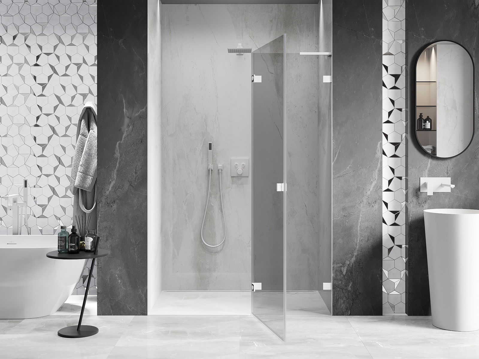 Praktická a pohodlná rukoväť je vyrobená z odolného a pevného kovu. Moderný tvar v kombinácii s povrchovou úpravou prispôsobenou farbe profilov dodáva celku moderný a štýlový vzhľad, zdôrazňujúc estetiku každej kúpeľne.