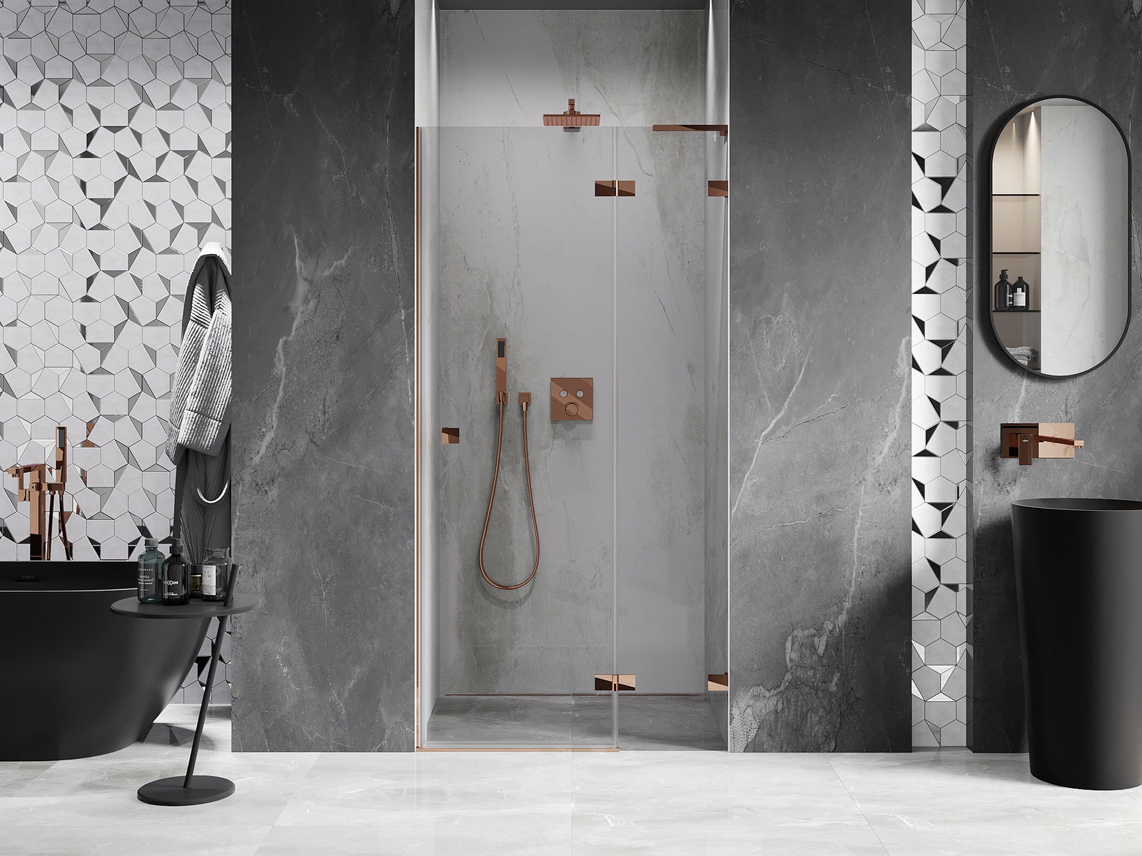 Praktická a pohodlná rukoväť je vyrobená z odolného a pevného kovu. Moderný tvar v kombinácii s povrchovou úpravou prispôsobenou farbe profilov dodáva celku moderný a štýlový vzhľad, zdôrazňujúc estetiku každej kúpeľne.