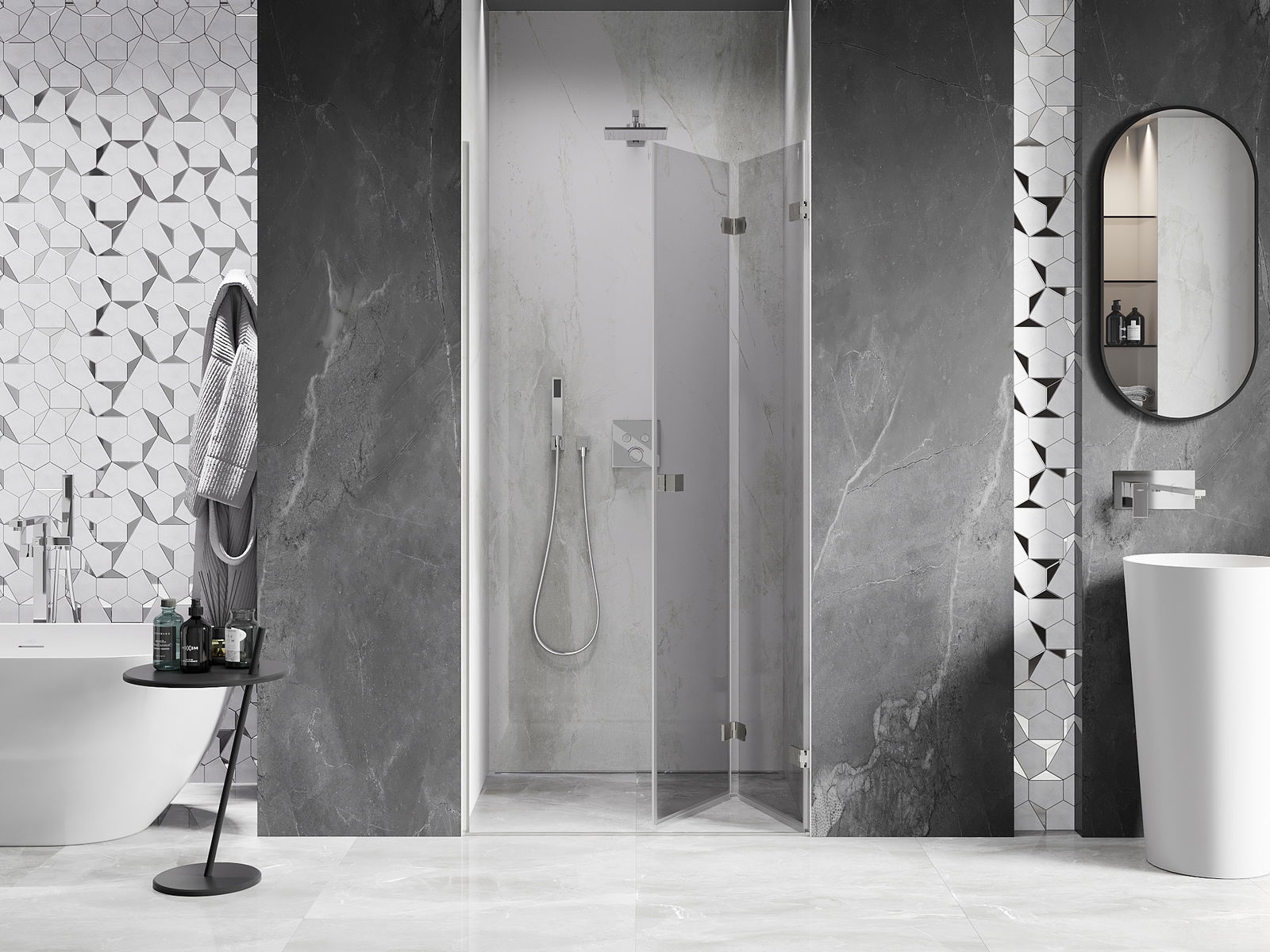 Možnosť skladania dverí, ako smerom von, tak aj smerom dnu, umožňuje získať viac priestoru počas nepoužívania sprchy. Je to ideálne riešenie pre menšie kúpeľne, maximálne využívajúce dostupnú plochu.